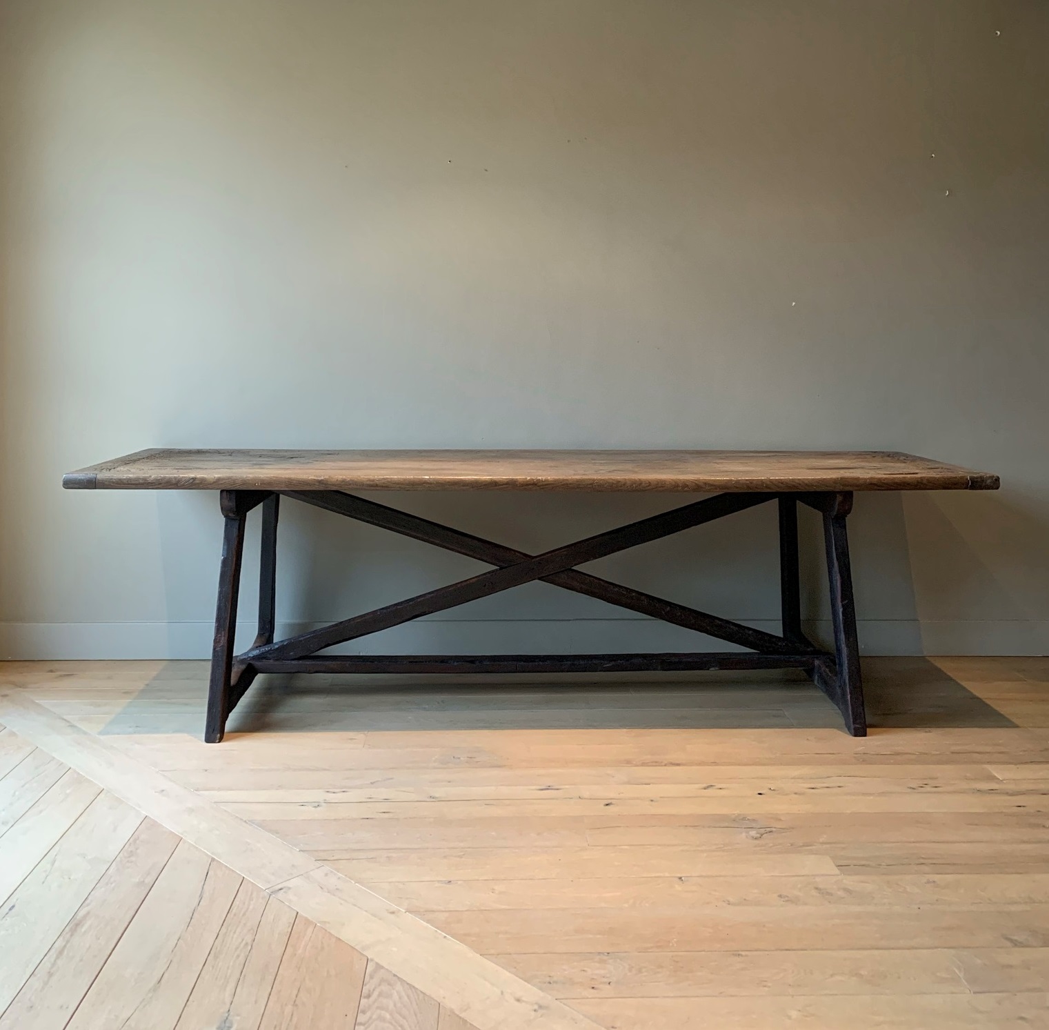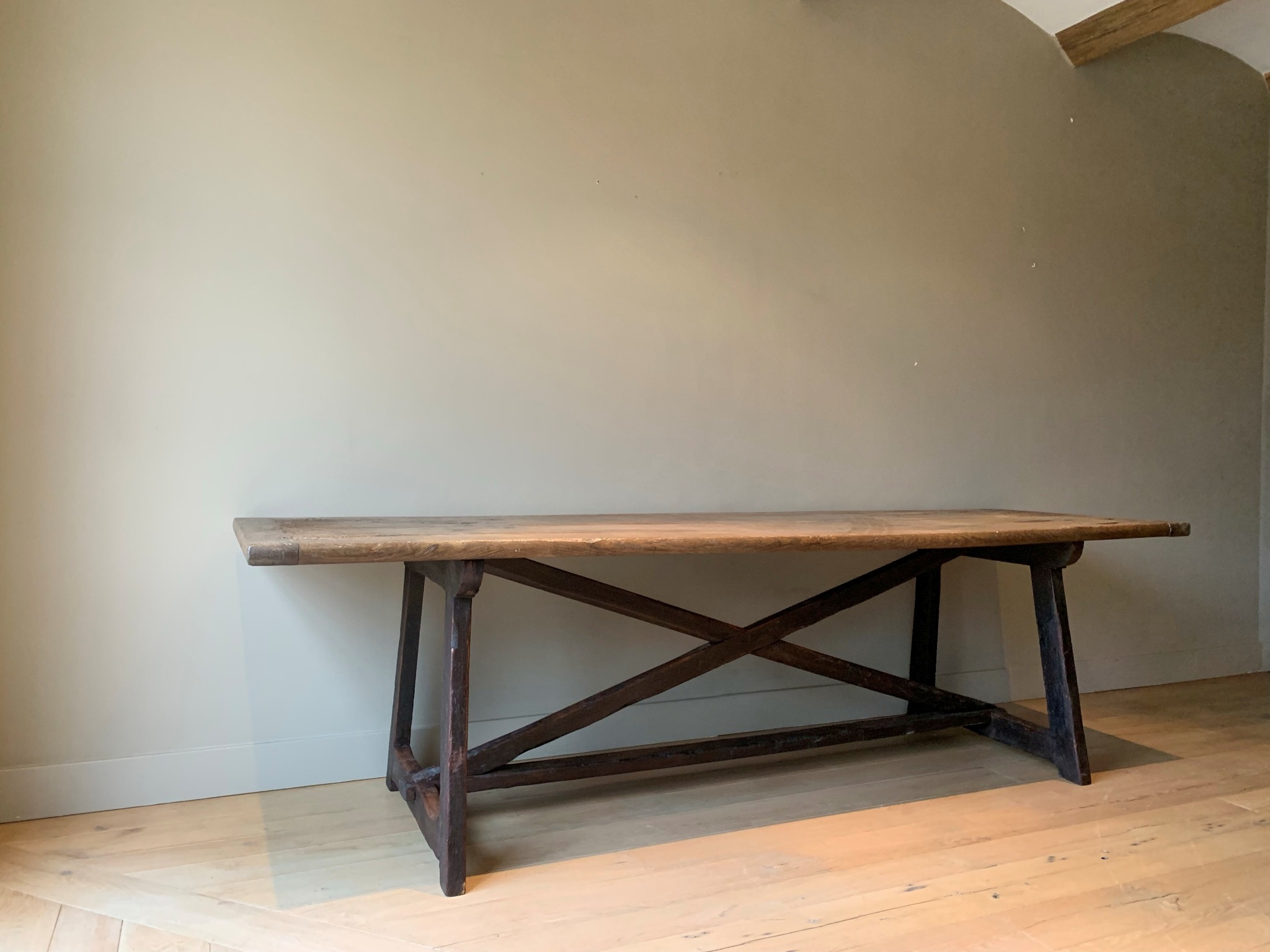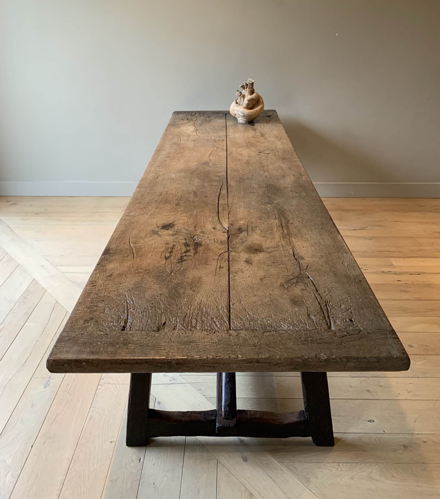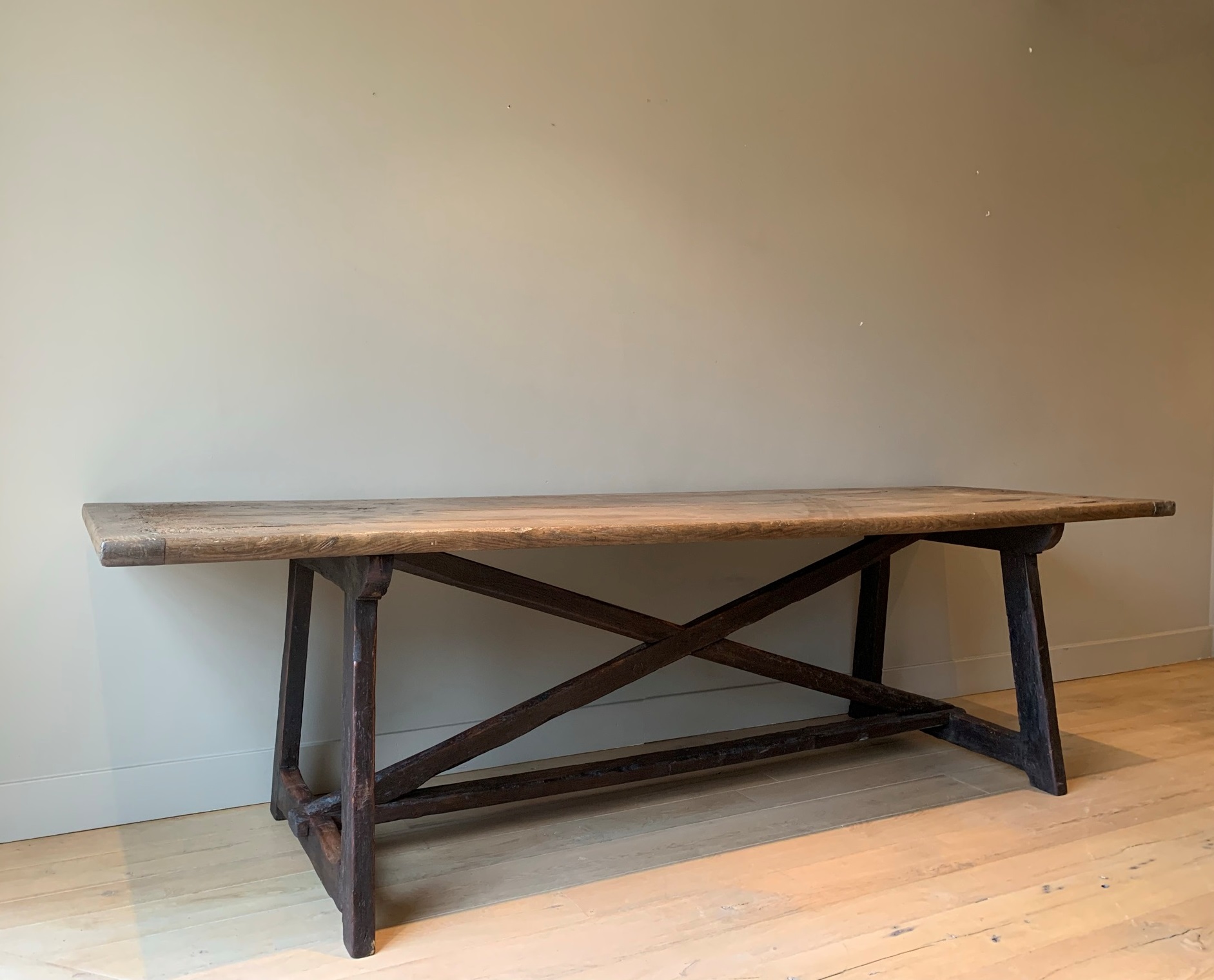 Een zeldzame en mooi geproportioneerde grote schraagtafel uit de Pyreneeën. Eettafels zoals deze werden eeuwenlang gemaakt door ambachtslieden op het platteland. Dit specifieke exemplaar is volledig met de hand gemaakt en er zijn twee enorme eiken planken van dezelfde boom gebruikt. Om eik zo breed te laten zijn, moest de boom zelf meer dan 100 jaar oud zijn.