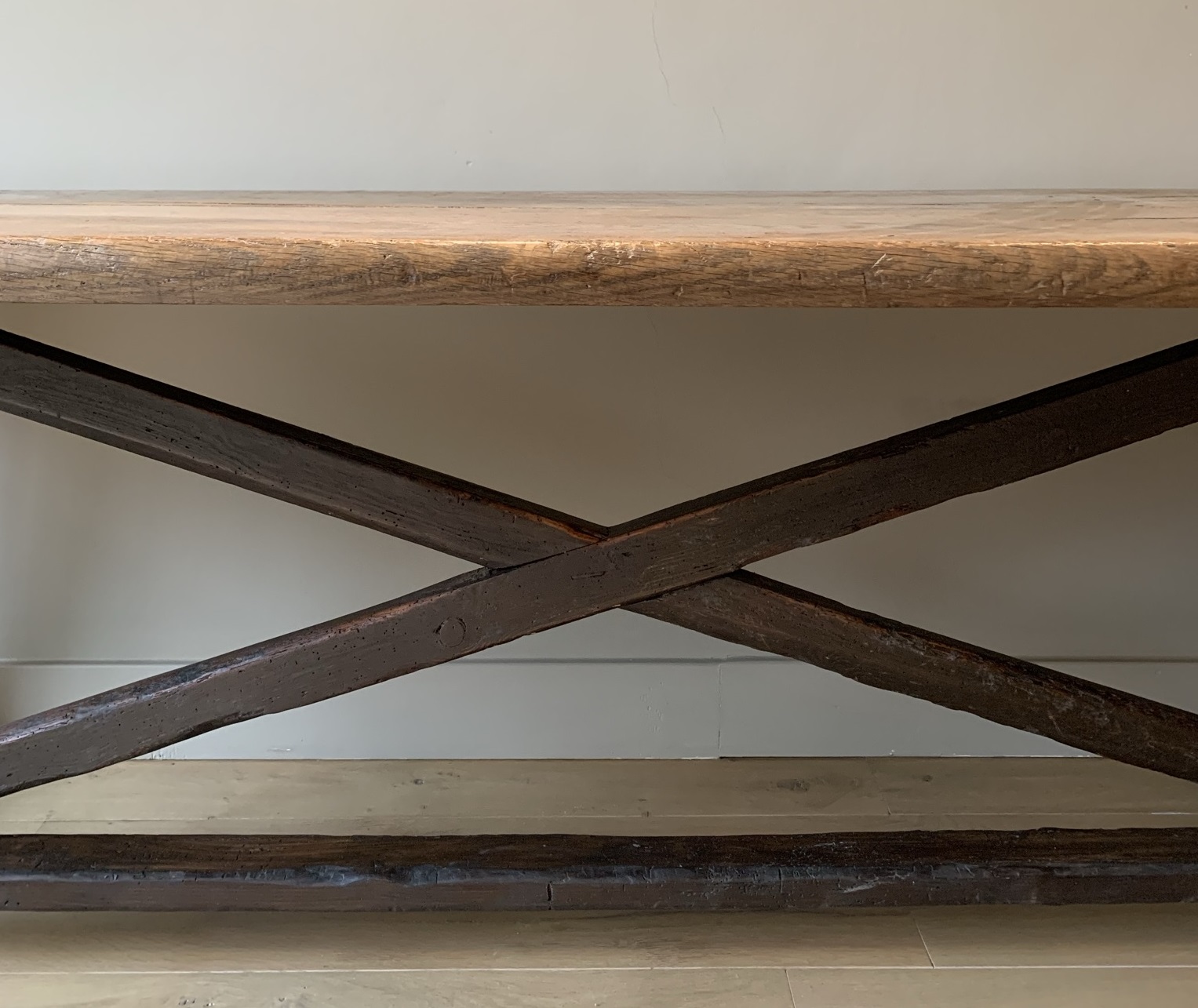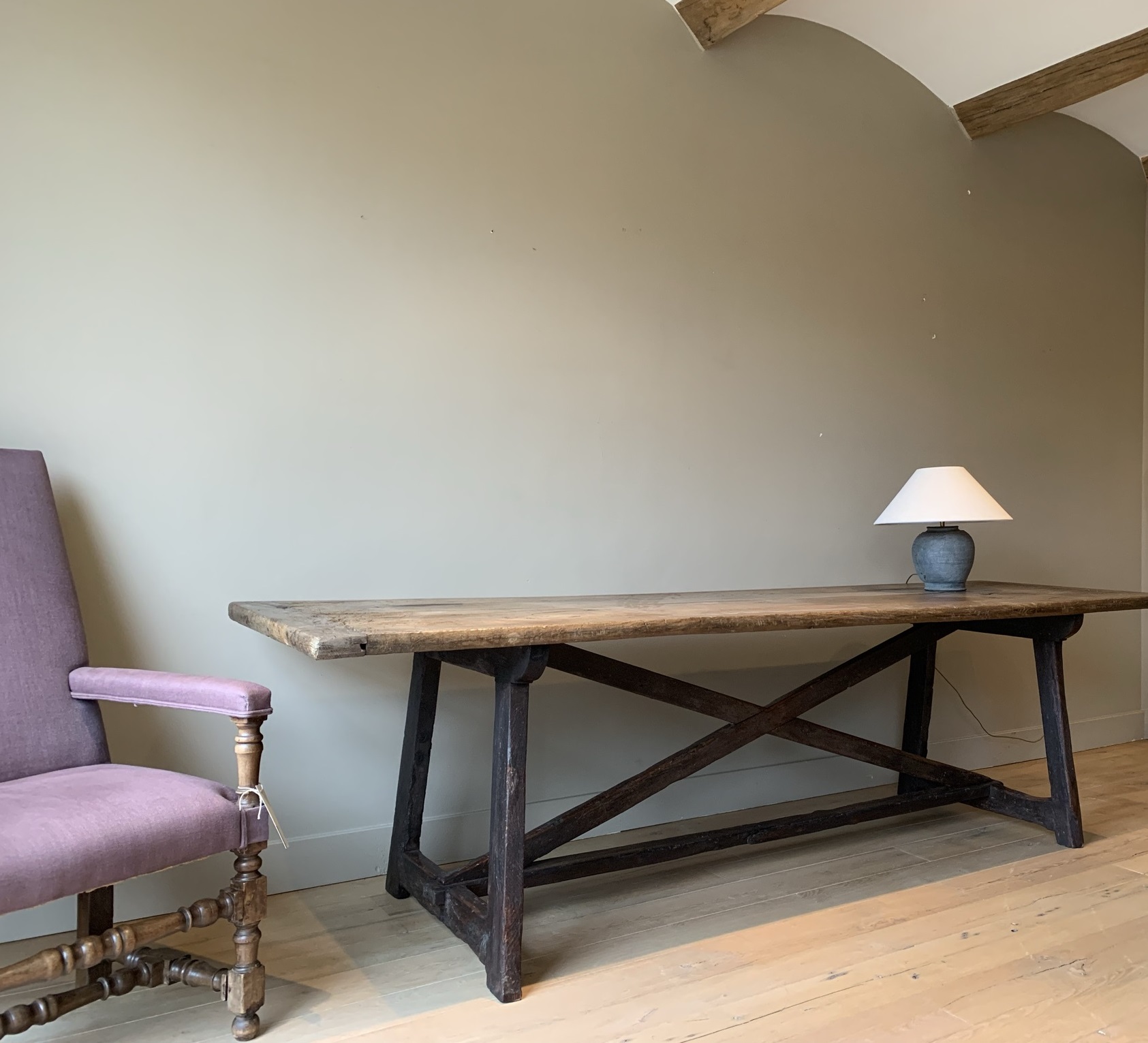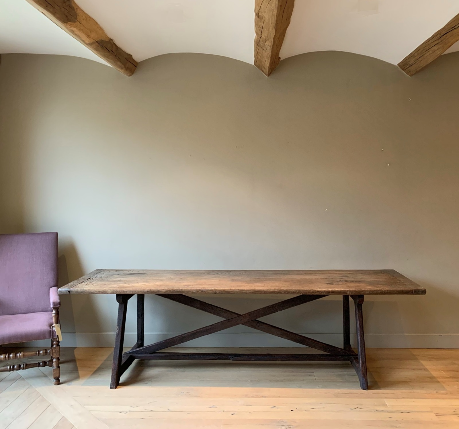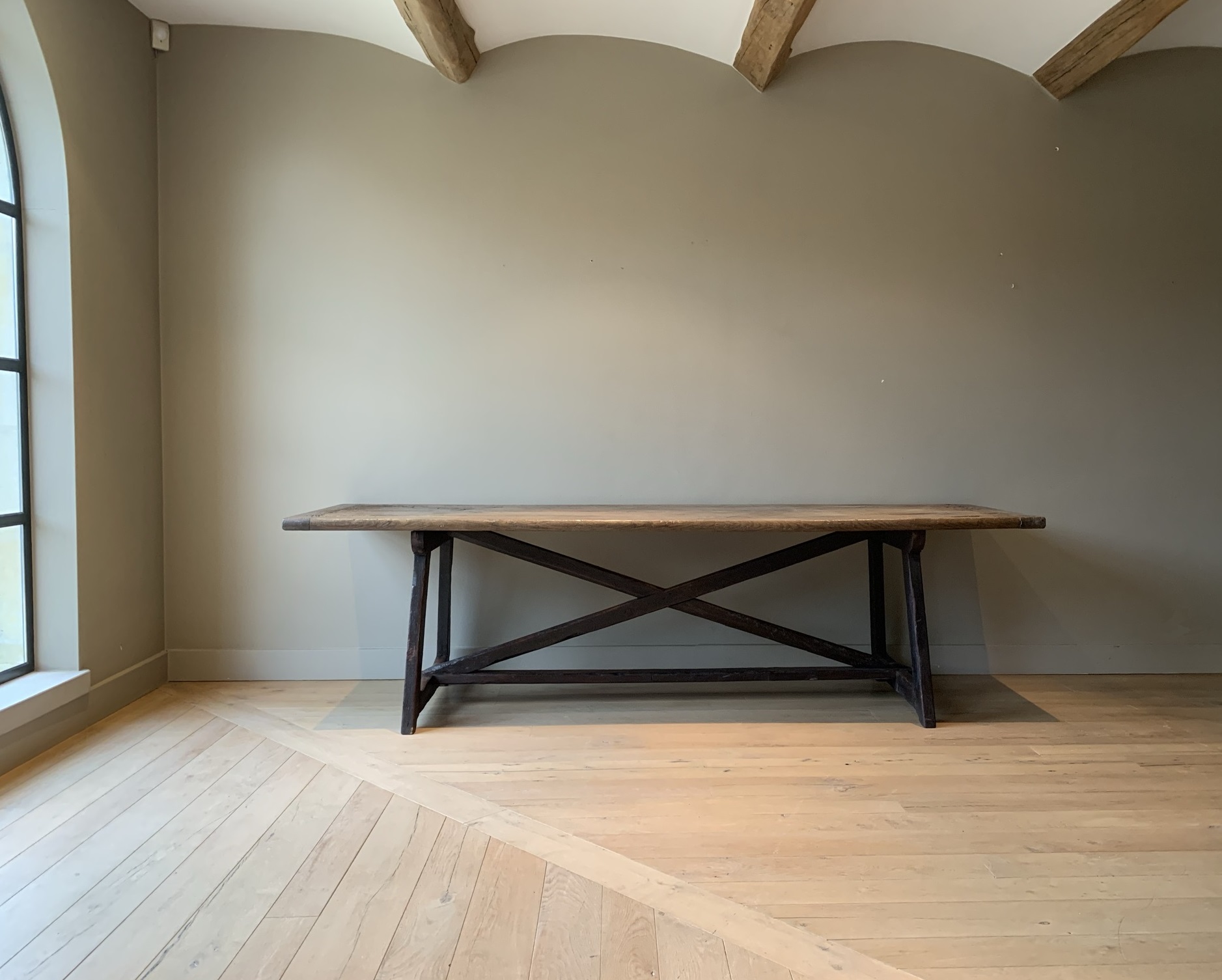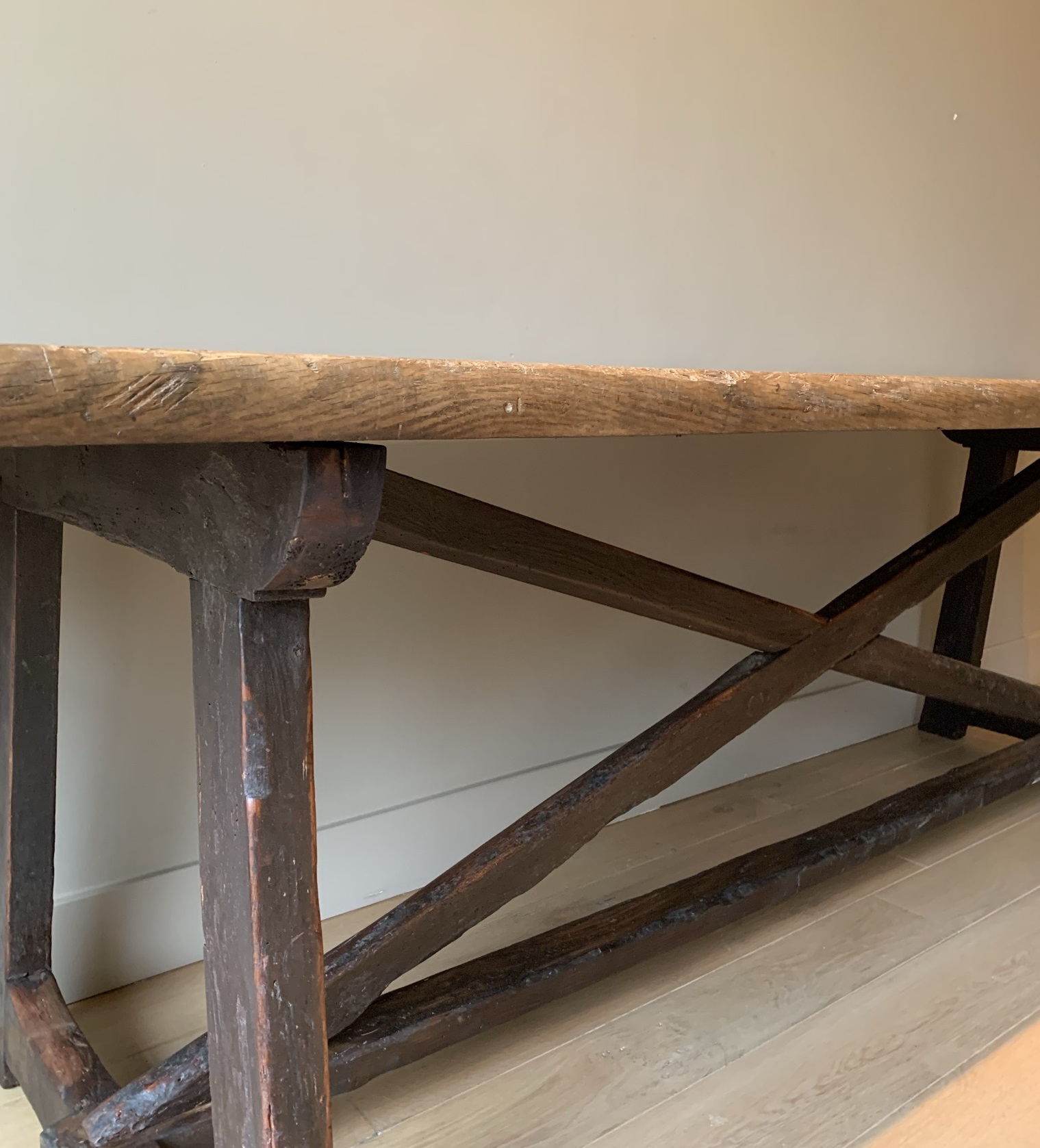 Een zeldzame en mooi geproportioneerde grote schraagtafel uit de Pyreneeën. Eettafels zoals deze werden eeuwenlang gemaakt door ambachtslieden op het platteland. Dit specifieke exemplaar is volledig met de hand gemaakt en er zijn twee enorme eiken planken van dezelfde boom gebruikt. Om eik zo breed te laten zijn, moest de boom zelf meer dan 100 jaar oud zijn.