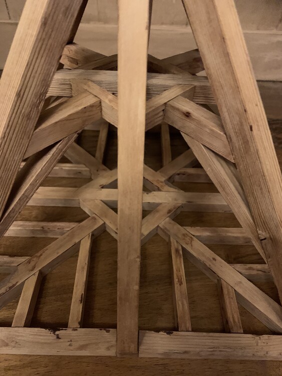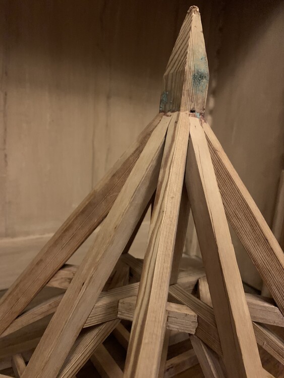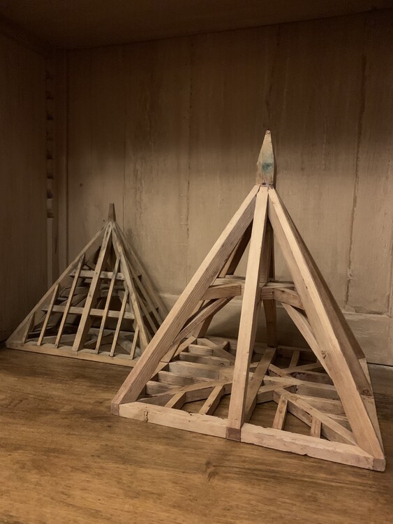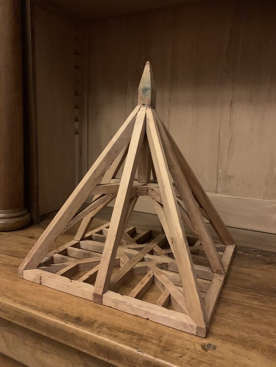 Architectonische modellen zoals deze zijn gemaakt door leerlingen of meesters om een titel aan te vragen door hun respectieve gilde. In Frankrijk stonden deze ambachtslieden bekend als de 'Compagnons du Devoir'. Ze begonnen hun carrière door door Frankrijk te reizen, soms door Europa, en tijdelijke plaatsen in te nemen in werkplaatsen door het hele land. Telkens leerden ze nieuwe dingen en materialiseerden ze die in steeds complexere schaalmodellen. Cruciaal in hun opleiding was het begrip van verhoudingen. Deze wetenschap werd zeer serieus genomen en was gebaseerd op eeuwenlange transcripties die teruggaan tot de Egyptenaren. Timmerlieden gebruikten deze kennis in hun ontwerpen en maakten typisch studies van dakmodellen in verschillende vormen en maten. Voordat ze hun educatieve reizen konden beëindigen en zich in een stad konden vestigen, moesten ze eindelijk een meesterwerk of Piece de Maitrise afleveren. En als ze werden goedgekeurd, kregen ze het recht om hun eigen winkel te openen. Dit zachthouten model uit het begin van de 19e eeuw heeft elegante geometrische lijnen met goudgeslepen proporties. Het heeft een moderne abstracte uitstraling en ondertussen toont zijn warme patina zijn geschiedenis.