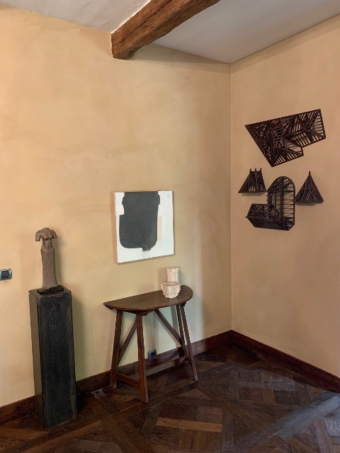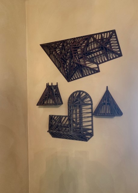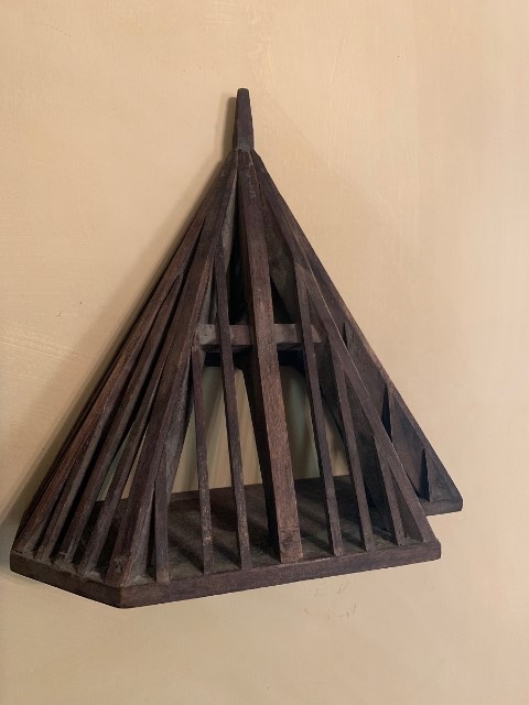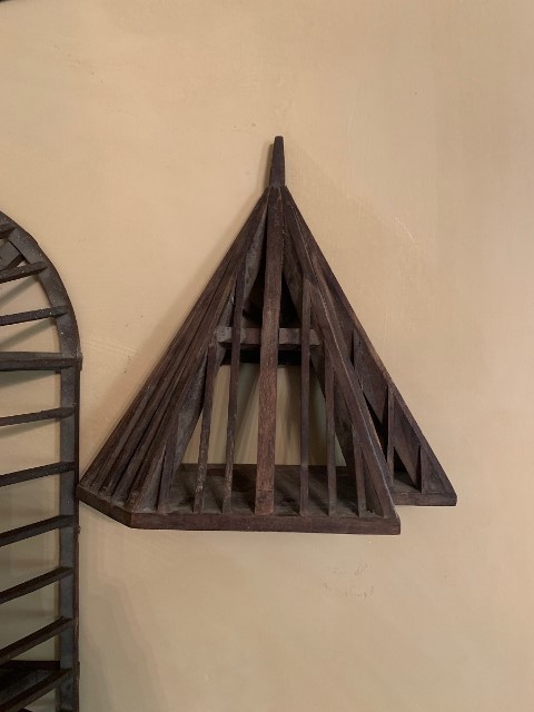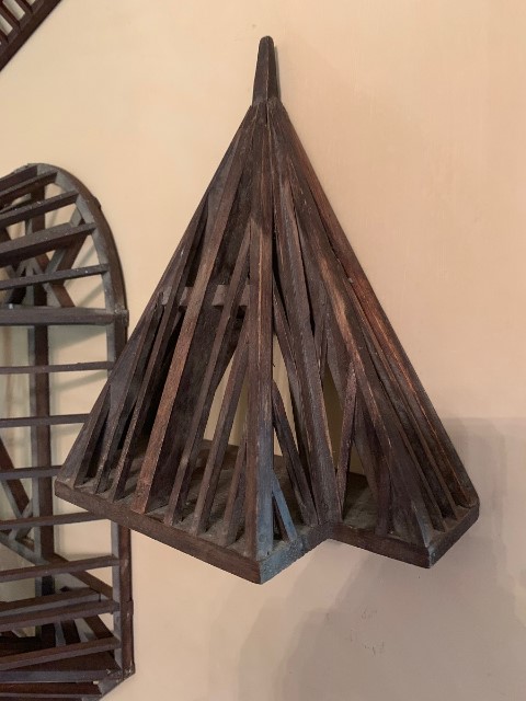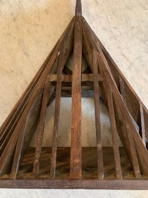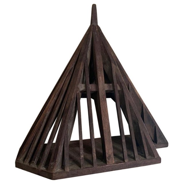 Architecturale modellen zoals deze zijn gemaakt door leerlingen of meesters om toe te passen voor een titel bij hun respectieve gilde. In Frankrijk stonden deze ambachtslieden bekend als de 'Compagnons du Devoir'. Ze begonnen hun carrière door door Frankrijk te reizen, soms door Europa en tijdelijke plaatsen in werkplaatsen door het hele land in te nemen. Telkens leerden ze nieuwe dingen en materialiseerden ze die in steeds complexere schaalmodellen. Cruciaal in hun opleiding was het begrip van verhoudingen. Deze wetenschap werd zeer serieus genomen en was gebaseerd op eeuwenlange transcripties die teruggaan tot de Egyptenaren. Timmerlieden gebruikten deze kennis in hun ontwerpen en maakten typisch studies van dakmodellen in verschillende vormen en maten. Voordat ze hun educatieve reizen konden beëindigen en zich in een stad konden vestigen, moesten ze eindelijk een meesterwerk of Piece de Maitrise afleveren. En als ze werden goedgekeurd, kregen ze het recht om hun eigen winkel te openen. Dit model uit zachthout uit de 19e eeuw heeft geometrische basislijnen in goudgeslepen proporties. Dit geeft het een modern abstract gevoel terwijl het warme patina zijn geschiedenis laat zien.