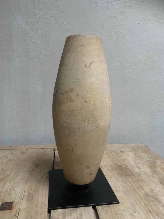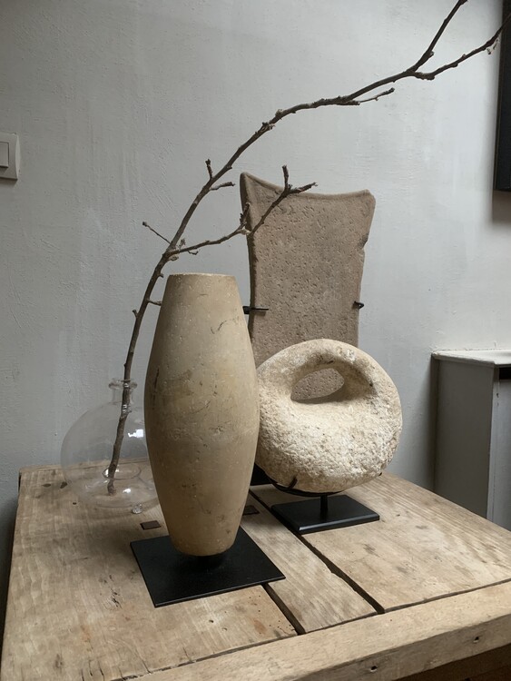 A Bactrian biconvex stone idol. Alongside column and staff idols these intriguing objects belong to the Bactria-Margana culture. An ancient civilization dating between the 3th and 4th millennium BC and occupying a large area between India and Afghanistan. It is believed objects like this were of spiritual importance referring to nature and fertility. This fascinating example is quite unusual in its shape and reminiscent to modernist sculpture (or the other way around). It has 2 custom stands, one for vertical and one for horizontal display.