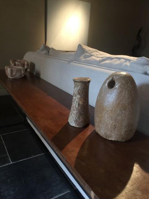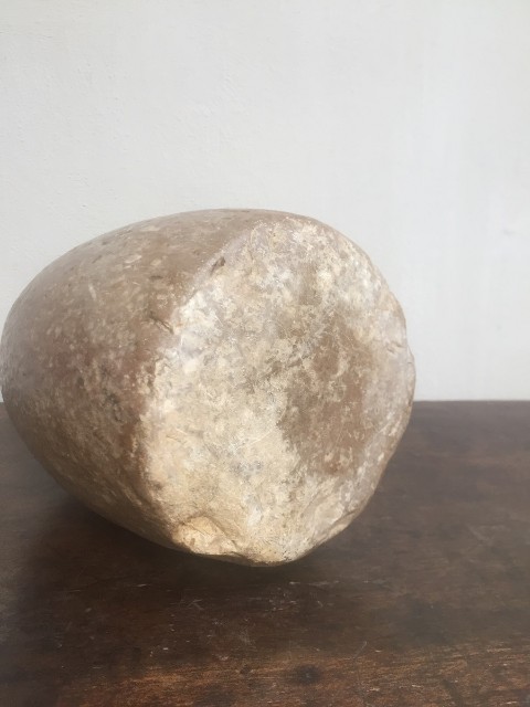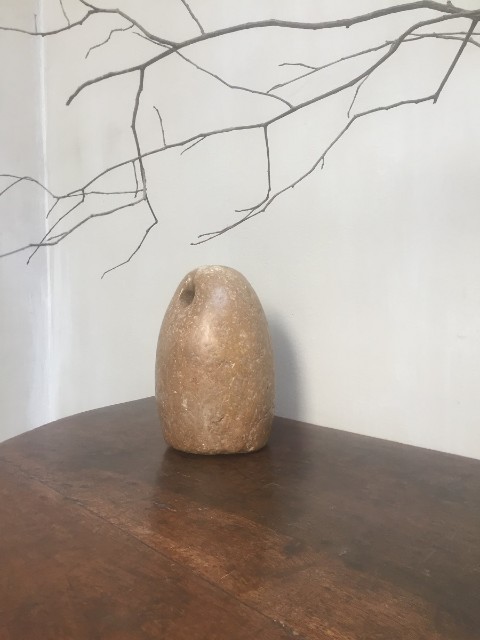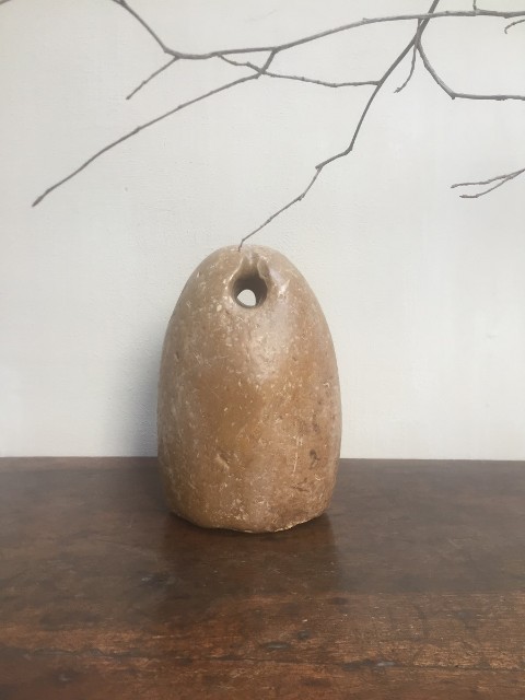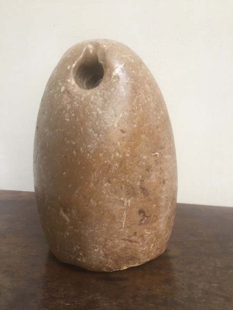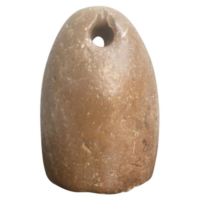 Een Bactrisch marmeren idool omstreeks eind 2e tot 1e millennium v.Chr. De Bactrische cultuur werd ontdekt door Sovjet-archeologen in de jaren '70 in Afghanistan. Ook wel de Oxus-cultuur genoemd, het werd gedateerd tussen 2300-1700 v.Chr. Deze beschaving bloeide in de valleien van Centraal-Azië tijdens de bronstijd en wordt beschouwd als een van de meest ontwikkelde samenlevingen van hun tijd. Er valt nog veel te ontdekken over deze mensen en hun artefacten. Scholars debatteren nog steeds over de functie van marmeren idolen die in het Bactria-Margiana-complex zijn gevonden. Hoewel sommigen denken dat het gewichten zijn om graan te meten (de belangrijkste handelswaar in die tijd en een maatstaf voor rijkdom), geloven de meesten dat het abstracte representaties zijn van spirituele concepten zoals aarde, hemel, vrouwelijk, mannelijk, enz. Dit item heeft wat krassen, verwering (pitting) en versleten in chips op het oppervlak. Geen restauratie aanwezig en ook geen scheuren. De boorgaten in het gat bovenaan zijn afkomstig van handmatige archaïsche boortechnieken. Dit stuk is in 2019 gekocht op de Amerikaanse kunstmarkt en was voorheen eigendom van een particuliere verzamelaar uit Zuid-Californië die het vóór 2000 heeft verworven. Een certificaat is bijgesloten.