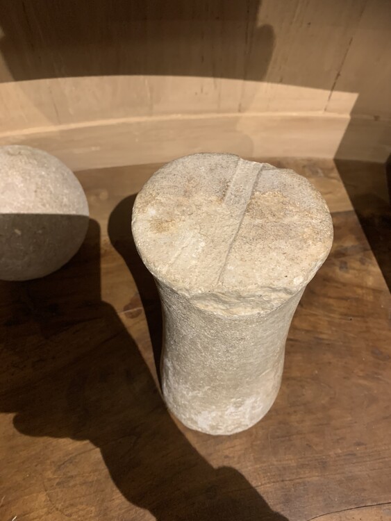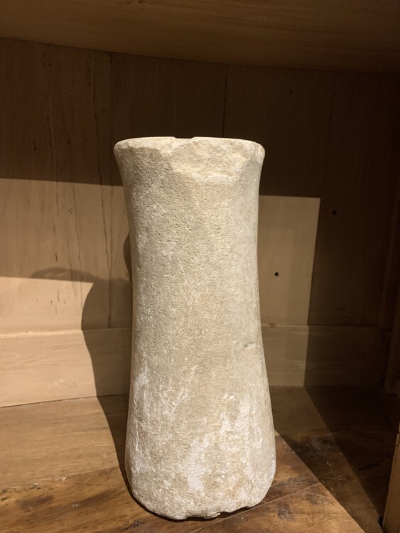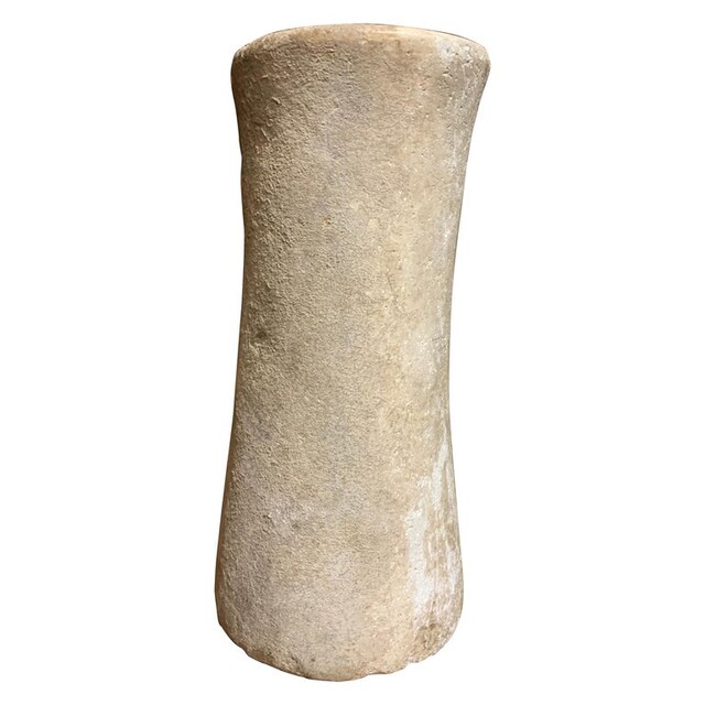 Bactrian sandstone column idol, circa 3000-2000 BC. It has an elegant tapering form with a undeep groove running on the top. The colomns t has incrustation on the side where it laid on the sand and the vains are deepened with time. The incrustated side is a bit darker in tone. There are no restaurations visible and the column has no breaches. On top there is one old chip missing. These columns are believed to be religious objects whereas others think they are counterweights. Undeniably they have an intrinsic abstract beauty which almost feels modern. Interestingly men in ancient times often chose to use abstract form to worship their deities all tough they perfectly were capable of figurative work. Simular ones available.