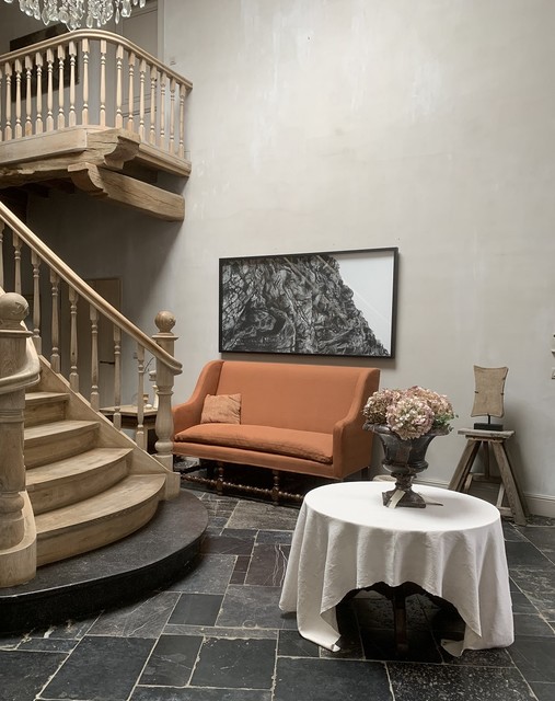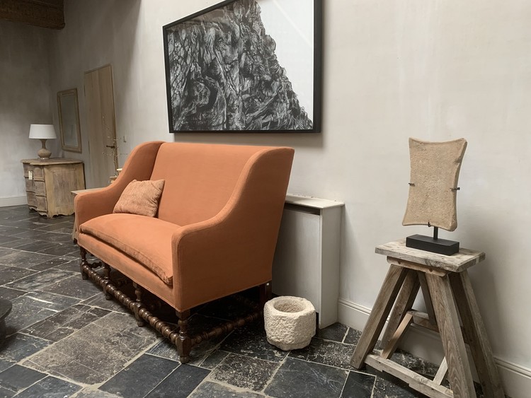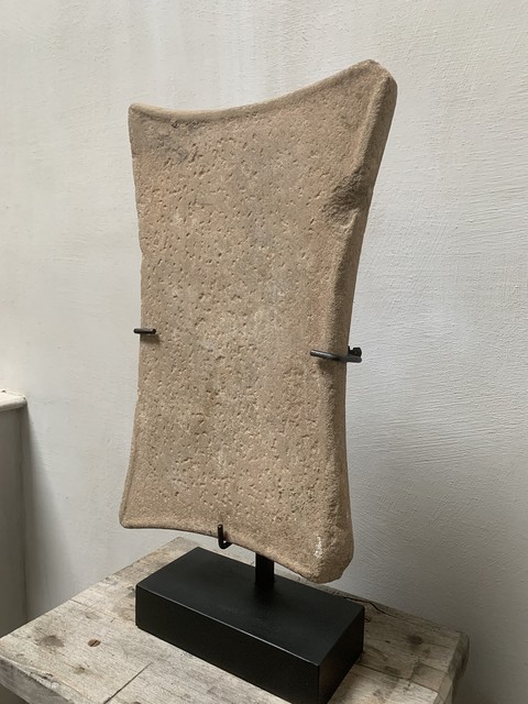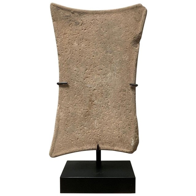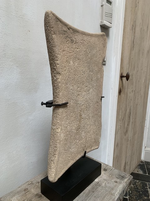 Een intrigerend object van Bactrische steen. Geleerden hebben gedebatteerd over het doel van de verschillende stenen voorwerpen die op verschillende sites zijn gevonden. Sommigen geloven dat ze een functioneel doel hebben, anderen geloven dat het afgoden van aanbidding zijn. In dit geval doet deze steen denken aan kleinere stenen olielampen maar dan misschien onafgewerkt. Maar het toont ook duidelijk de gebogen vorm van zuilidolen uit dezelfde cultuur. Ook de gevormde kant en het hameren van het oppervlak lijken heel opzettelijk en vormen bijna een geometrisch patroon. Dit kussenvormige stuk is plat aan de voorkant en gebogen aan de achterkant. Er wordt een tweede standaard meegeleverd om ook de achterkant te laten zien, die op zichzelf al prachtig is. Beide zijden hebben een mooie patina en vertonen kleine aardafzettingen. Als relikwie uit de tijd is het alles bij elkaar zeer raadselachtig en met zijn elegante vorm, sobere decoratie en geometrische opstelling voelt het bijna aan als een moderne sculptuur.... hoewel het duizenden jaren oud is.