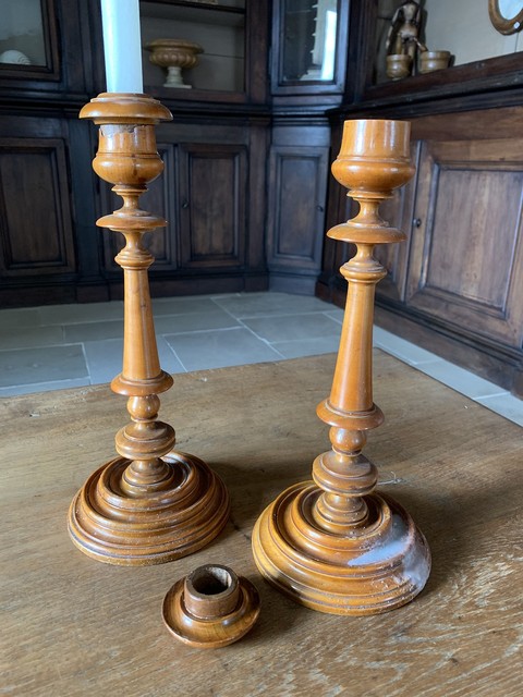 Een paar grote 18e-eeuwse Franse buxushouten gefineerde kandelaars. Mooi en fijn gedraaid. De bovenspoelen, zoals origineel, verwijderbaar voor schoonmaakdoeleinden. Bij een ervan ontbreekt een klein stukje fineer aan de bovenzijde. Omdat we ze regelmatig gebruiken, is er kaarsvet zichtbaar op de voetjes. Dit komt er eigenlijk gemakkelijk vanaf, dus laat het ons bij verkoop gewoon weten als we het moeten verwijderen.