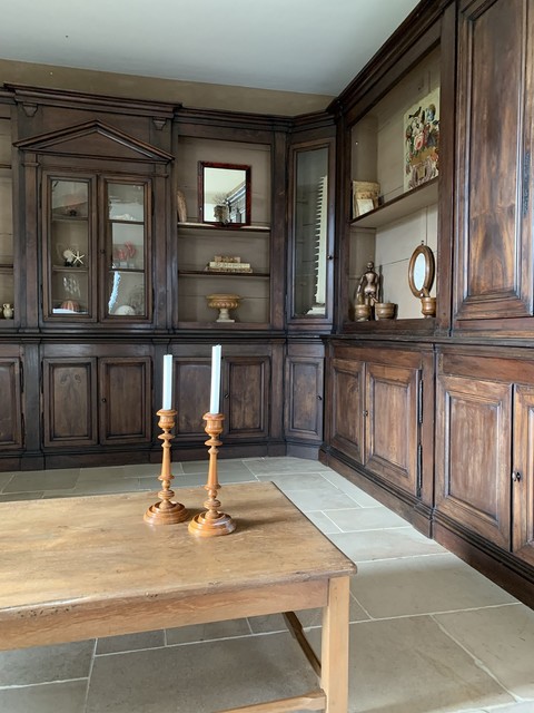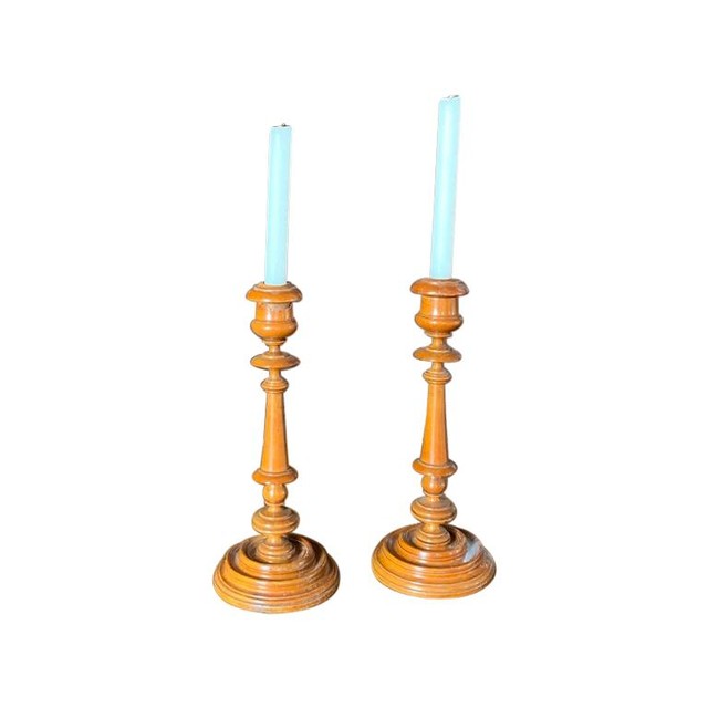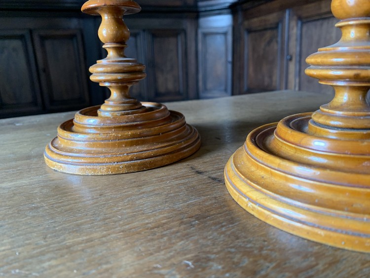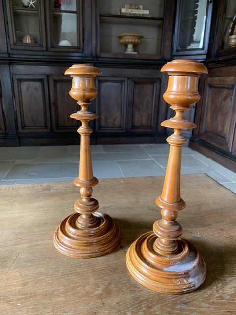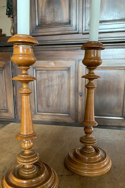 Een paar grote 18e-eeuwse Franse buxushouten gefineerde kandelaars. Mooi en fijn gedraaid. De bovenspoelen, zoals origineel, verwijderbaar voor schoonmaakdoeleinden. Bij een ervan ontbreekt een klein stukje fineer aan de bovenzijde. Omdat we ze regelmatig gebruiken, is er kaarsvet zichtbaar op de voetjes. Dit komt er eigenlijk gemakkelijk vanaf, dus laat het ons bij verkoop gewoon weten als we het moeten verwijderen.
