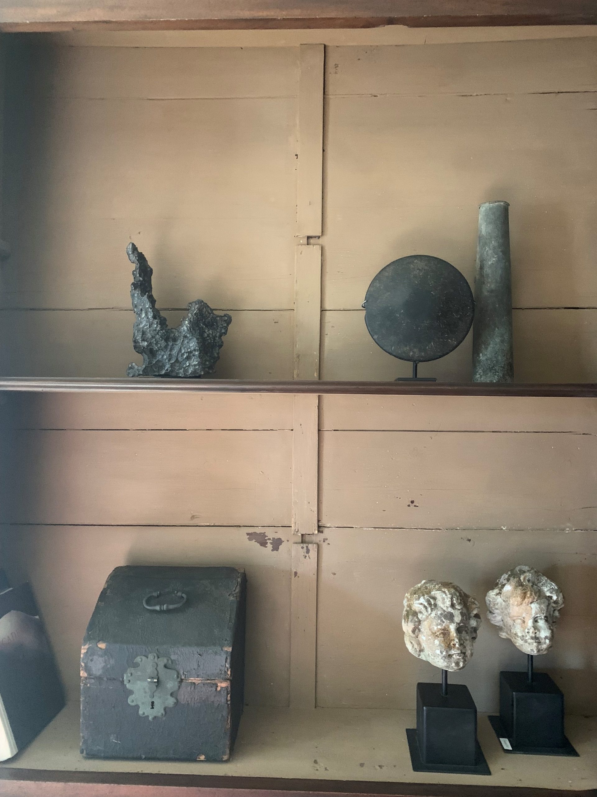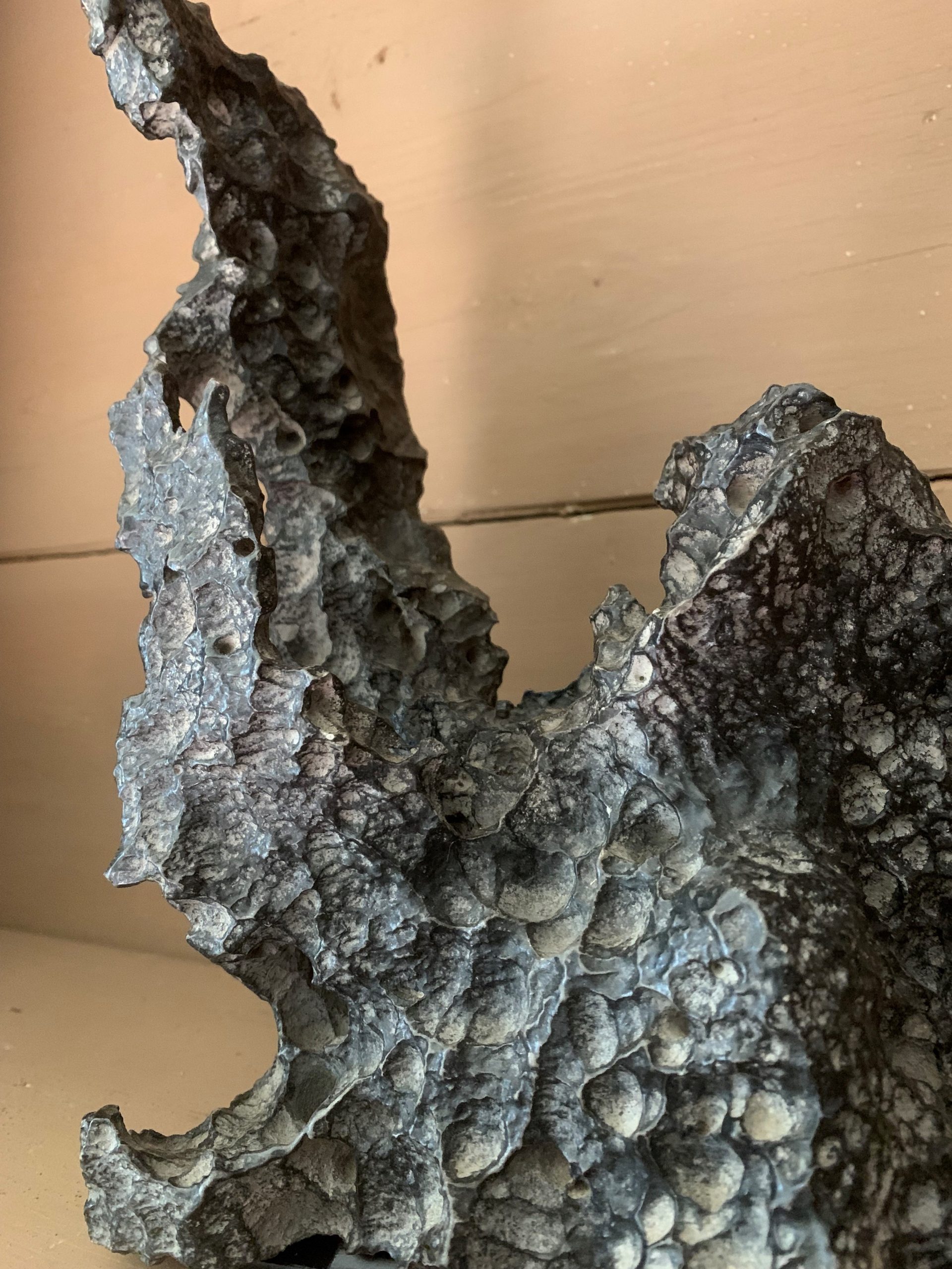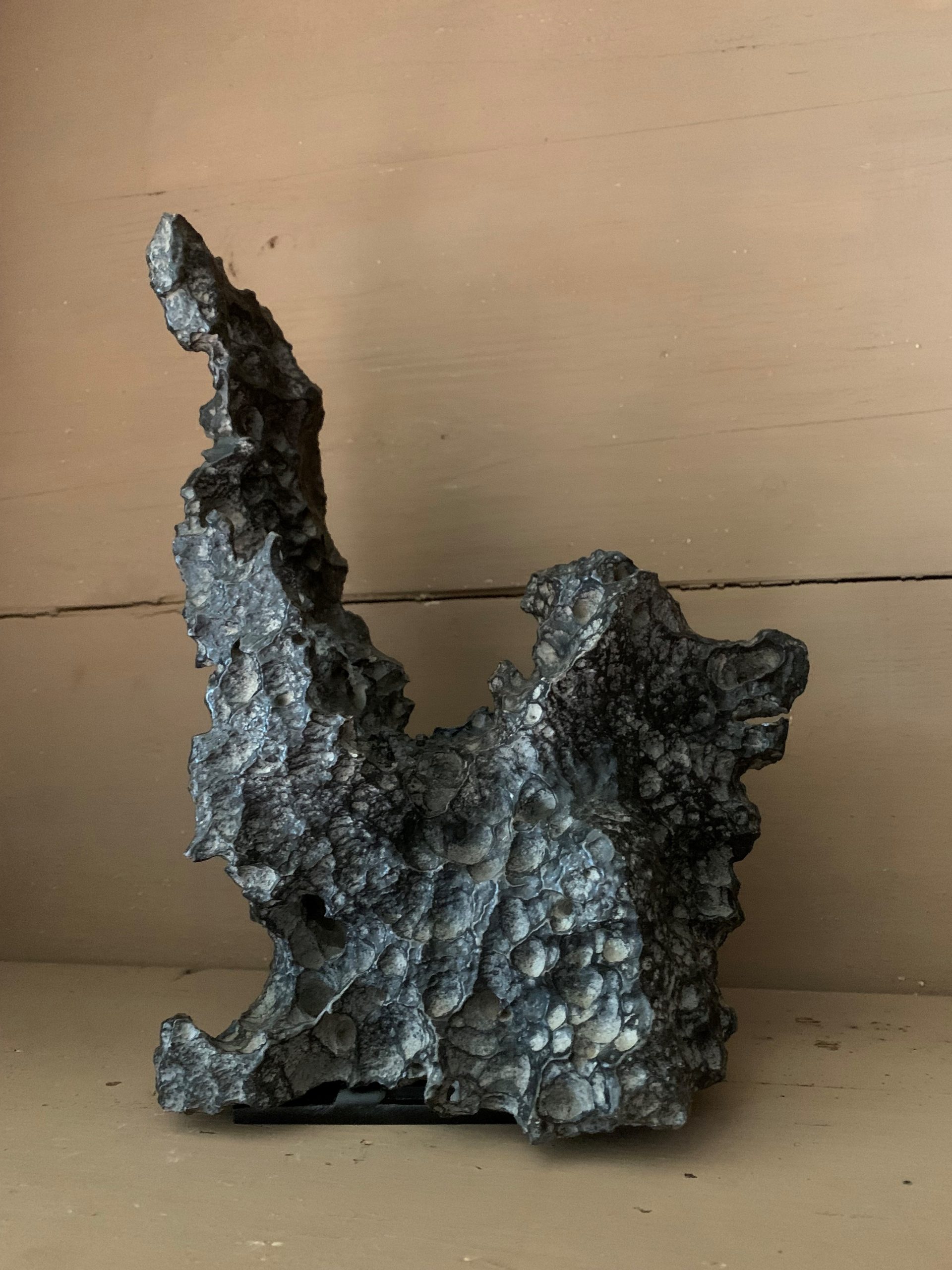 Een zogenaamde Scholar's Stone of Gonshi. Natuurlijk gevormde stenen zoals deze werden eeuwenlang verzameld door Chinese geleerden en filosofen als een meditatief hulpmiddel en iets van schoonheid. Deze specifieke is een exemplaar van een zandsteen genaamd zwarte Lingbi-steen (uit de Lingbi-provincie). We hebben dit natuurlijke beeld op een aparte kleine ijzeren standaard gemonteerd, zodat het op zichzelf lijkt te staan. 7x13x23u, 300