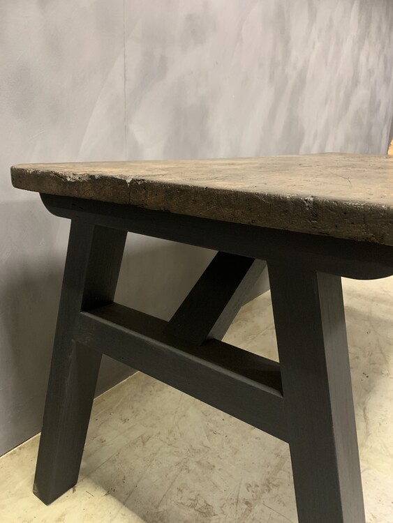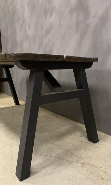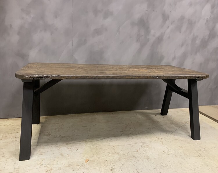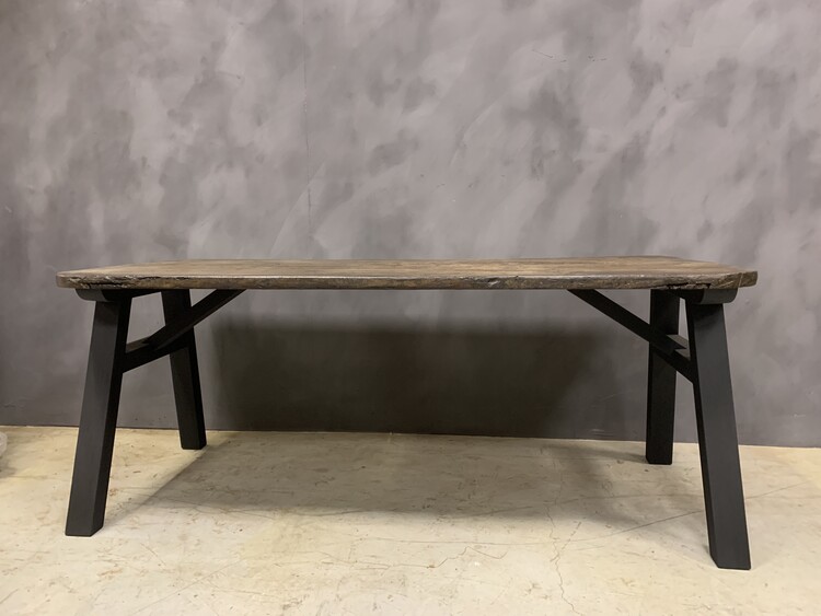 Onze 'Ateliertafel'. Deze tafel kan op maat worden gemaakt met een teruggewonnen blad naar keuze. Oud chenstnut, walnoot, eiken en naaldhout is beschikbaar (platen uit één stuk of uit meerdere planken). De basis maken we meestal van oud eikenhout dat op welke manier dan ook gepatineerd of gekleurd kan worden. Teruggewonnen voeten zijn ook mogelijk. De genoemde prijs is voor een formaat van circa 200 x 80 (79 x 32 inch).