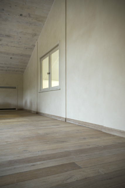 Vloeren van oude eiken wagonplanken met grijze krijtafwerking. Deze planken waren oorspronkelijk de wanden en vloeren van treinwagons. Onze ateliers maken deze terug legklaar als vloerplanken en kunnen ook instaan voor de plaatsing.