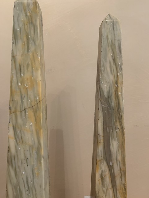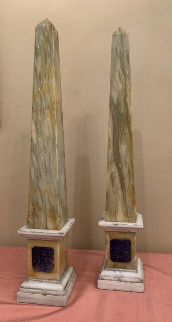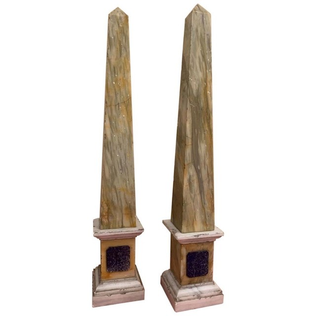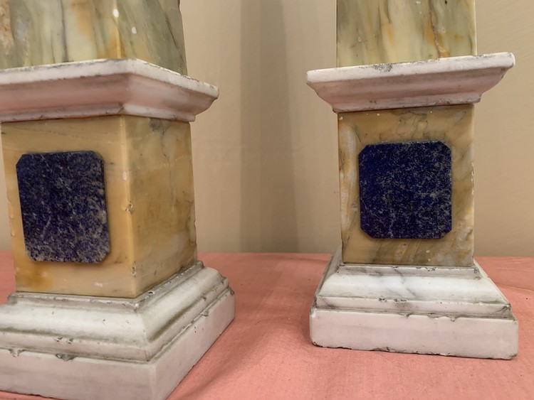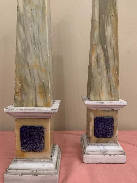 Een paar Grand Tour-obelisken uit de late 19e eeuw. Het lijstwerk in Carara, de sokkel in Sienna, de plaquette in Lapis Lazuli en de obelisken zelf in onyx.