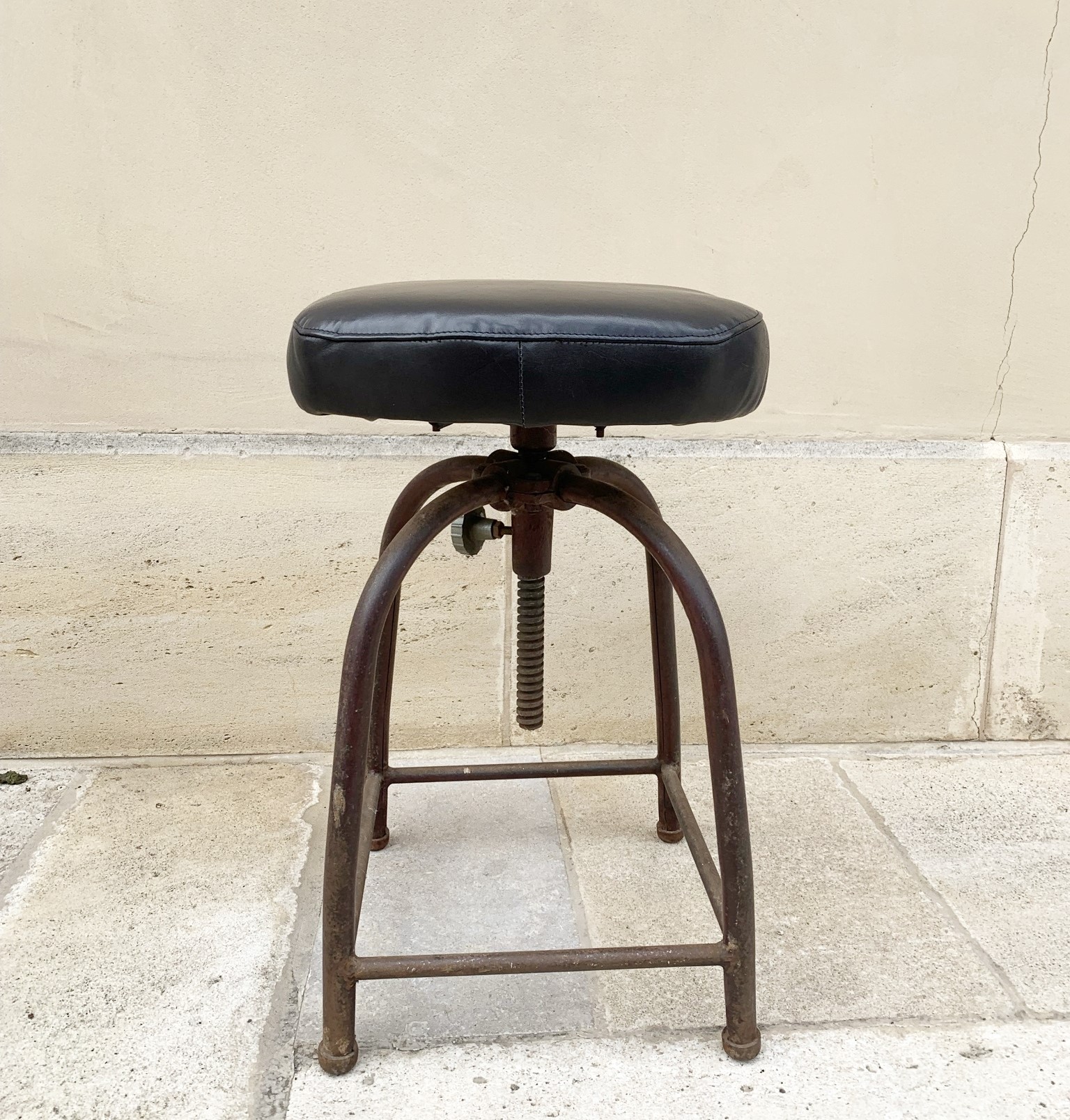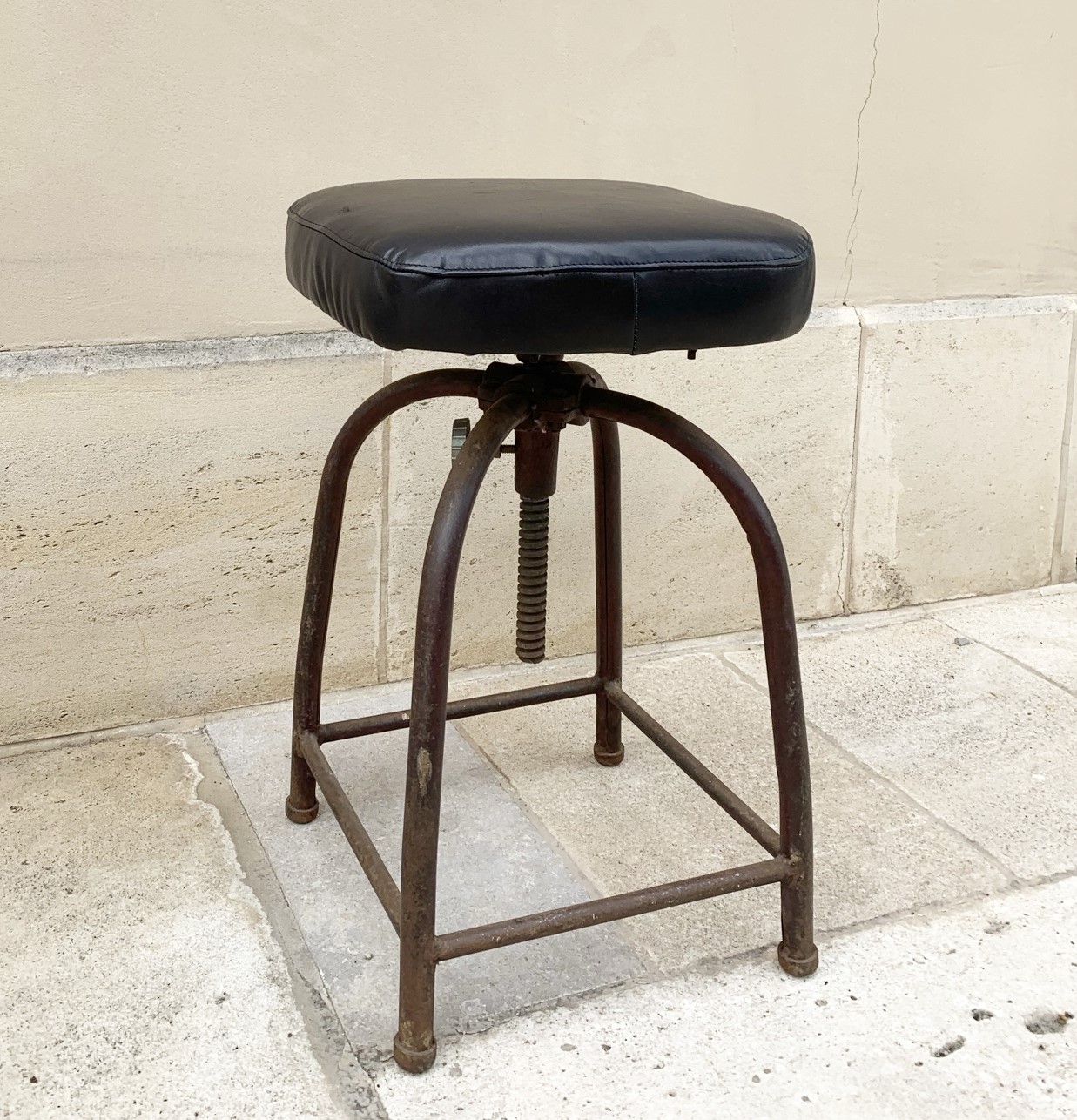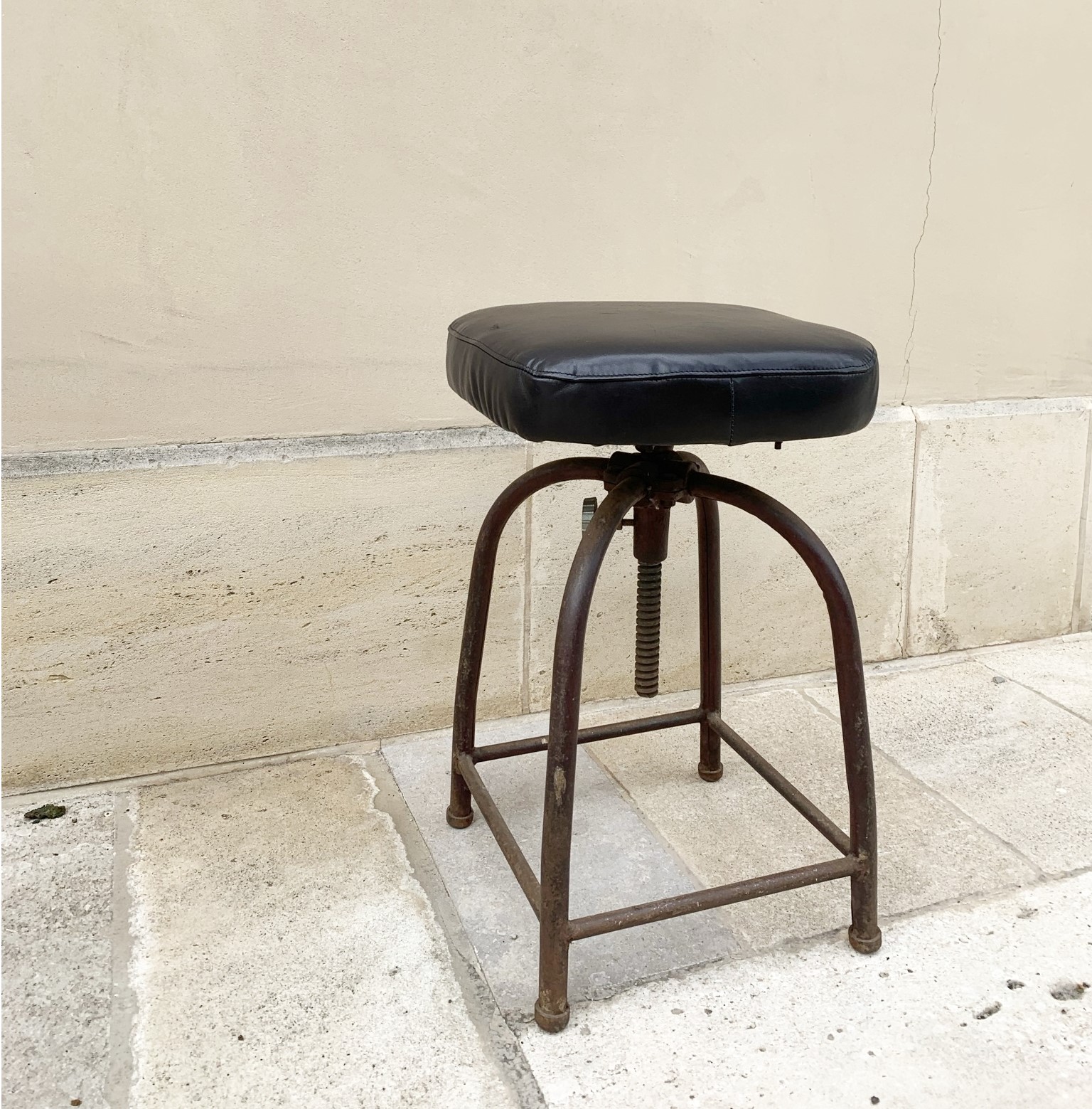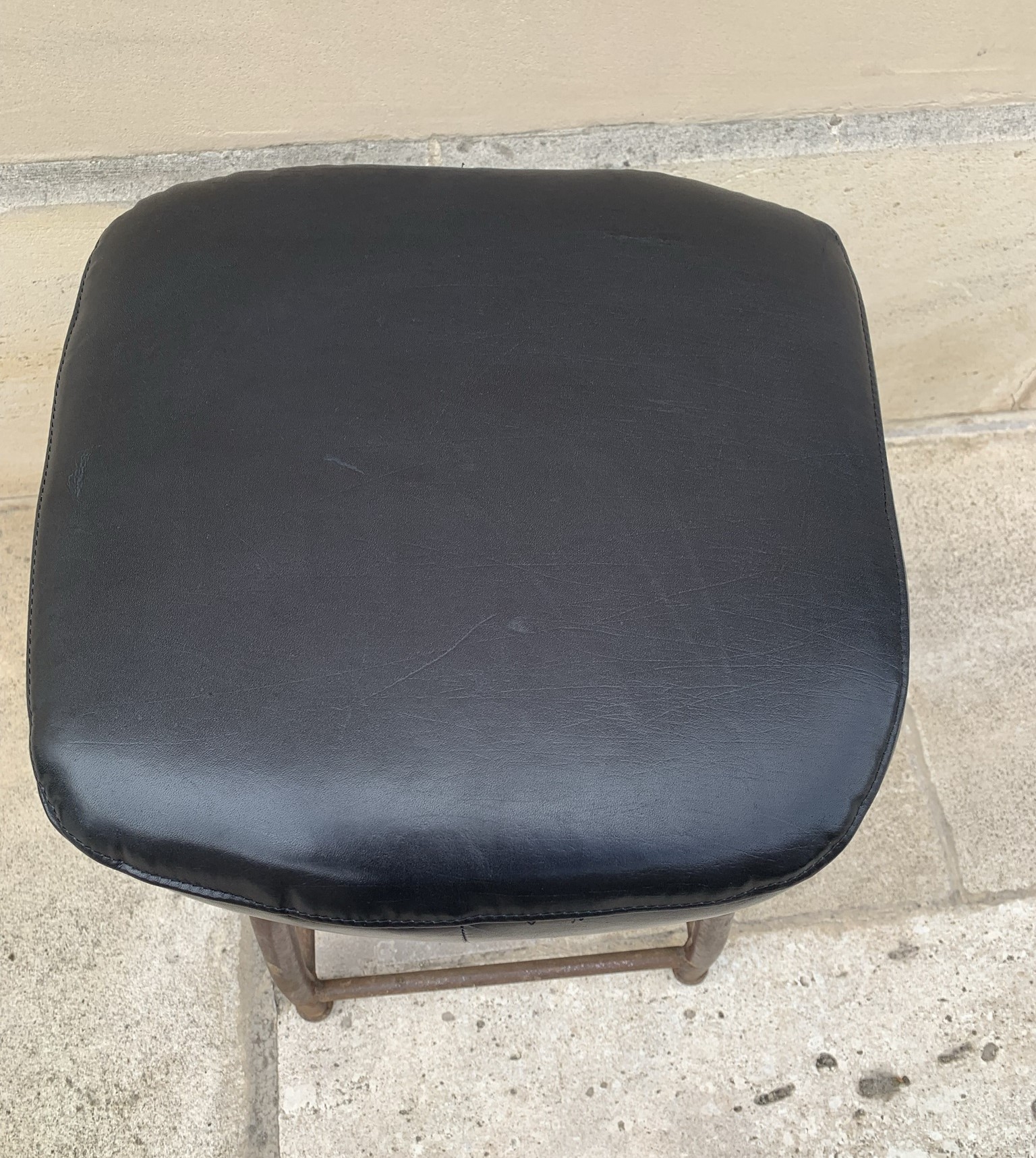 Industriële leren en ijzeren draaikruk uit de jaren 1930-1940. De maximale hoogte is 75 cm of 29,5 inch. Het leer is oude herstoffering en is in goede staat. Subtiele patina en zeer comfortabel. Het strijkijzer heeft een vervaagde oude verflaag.