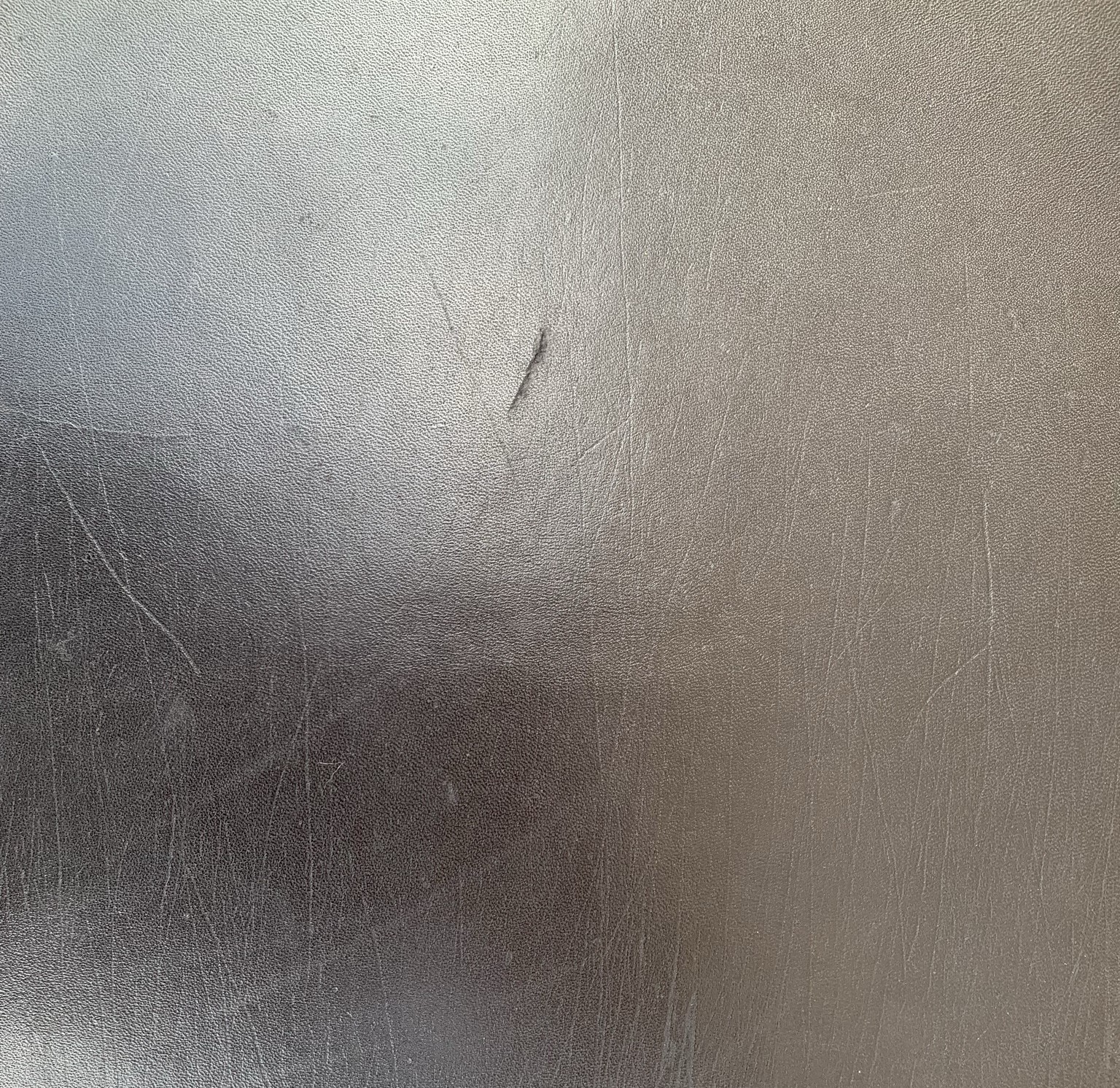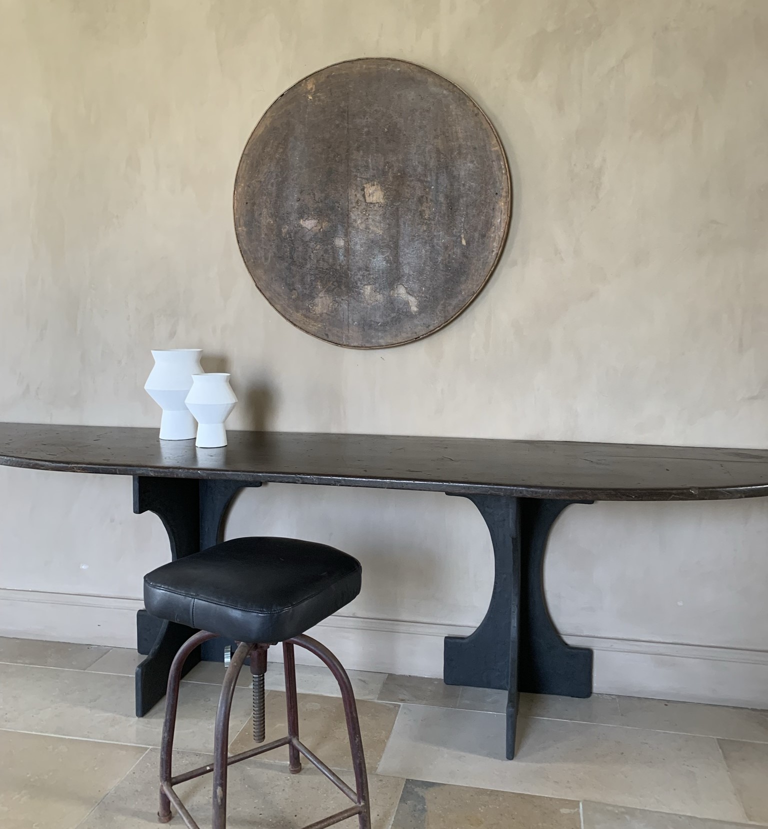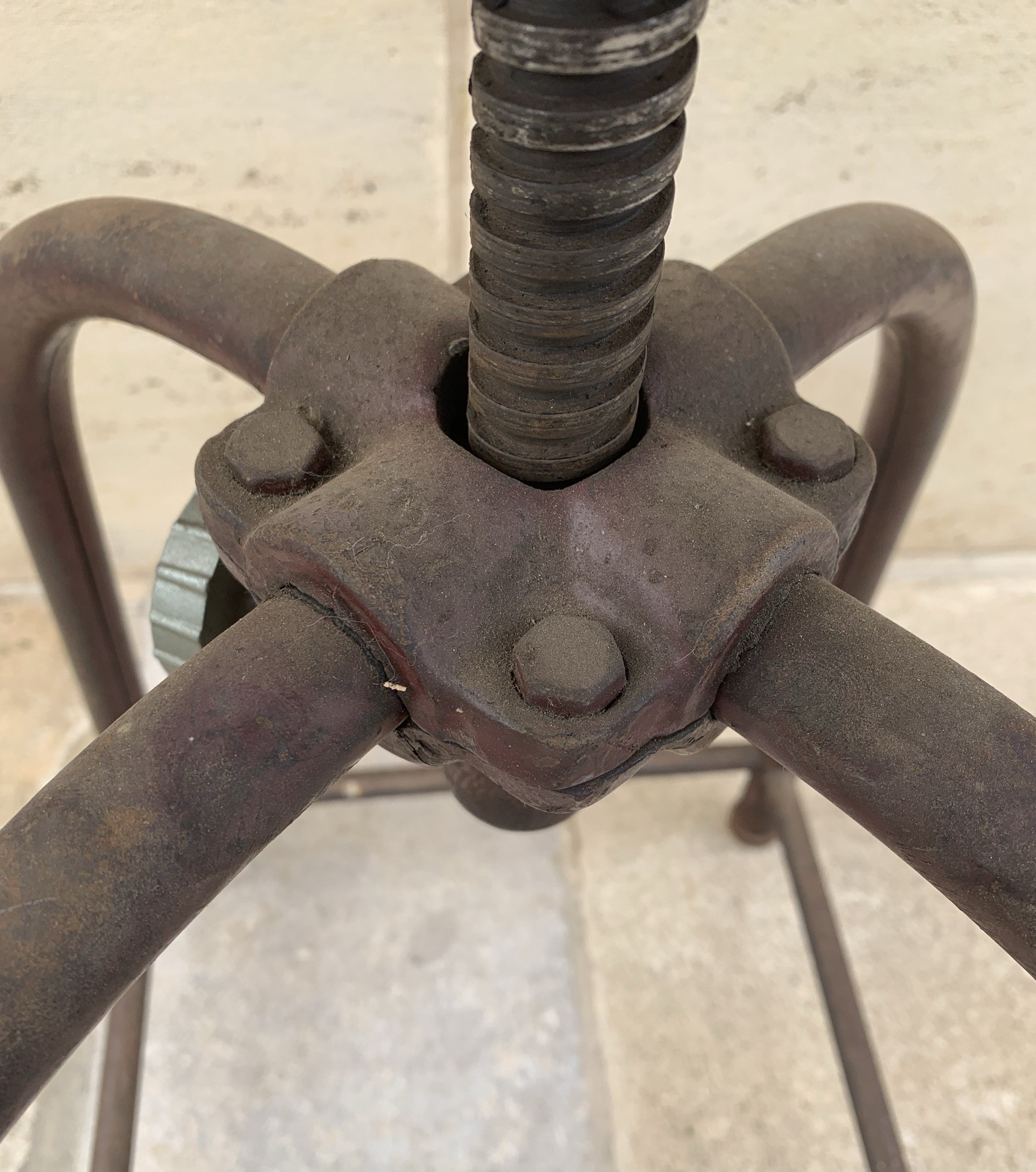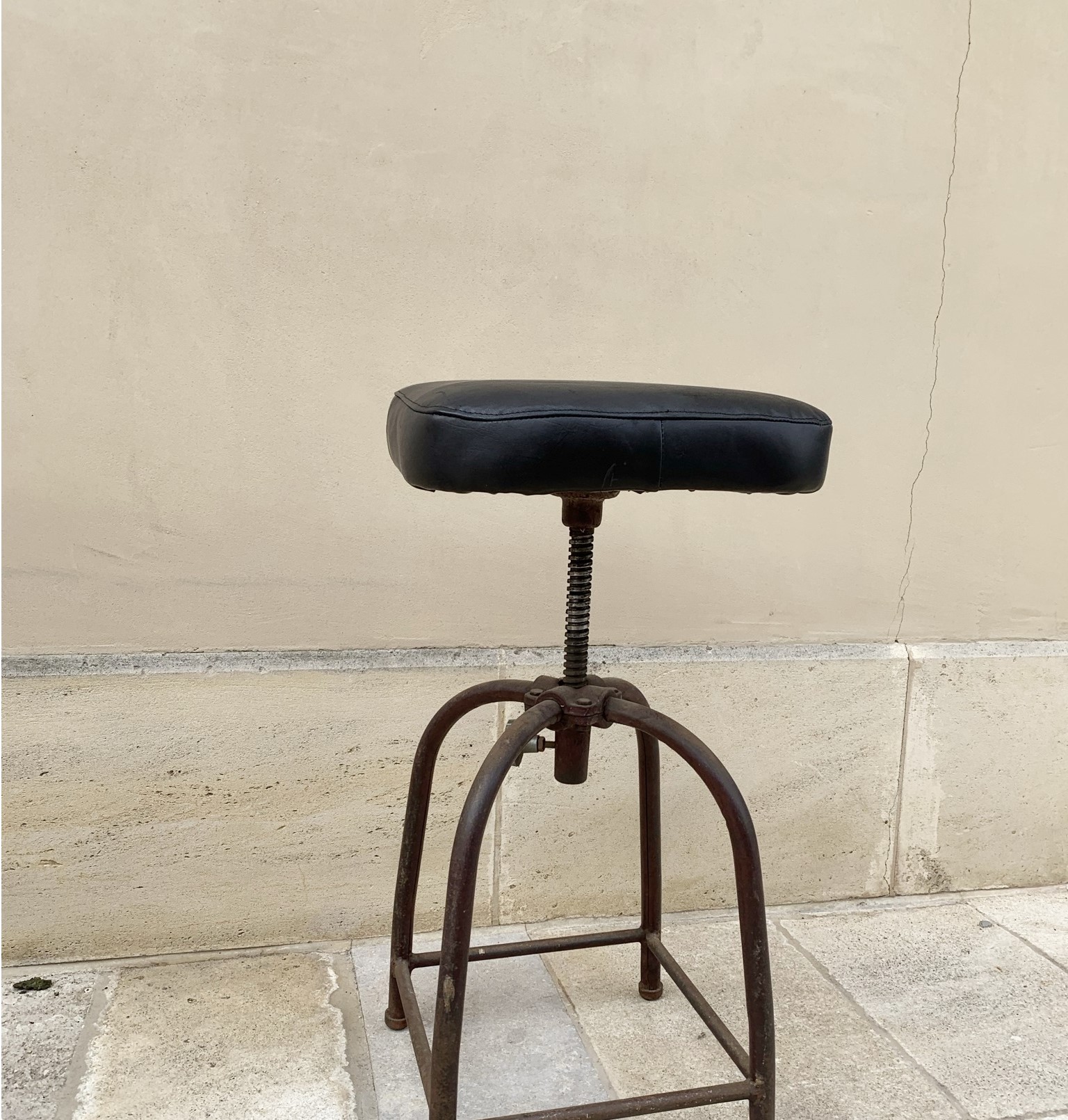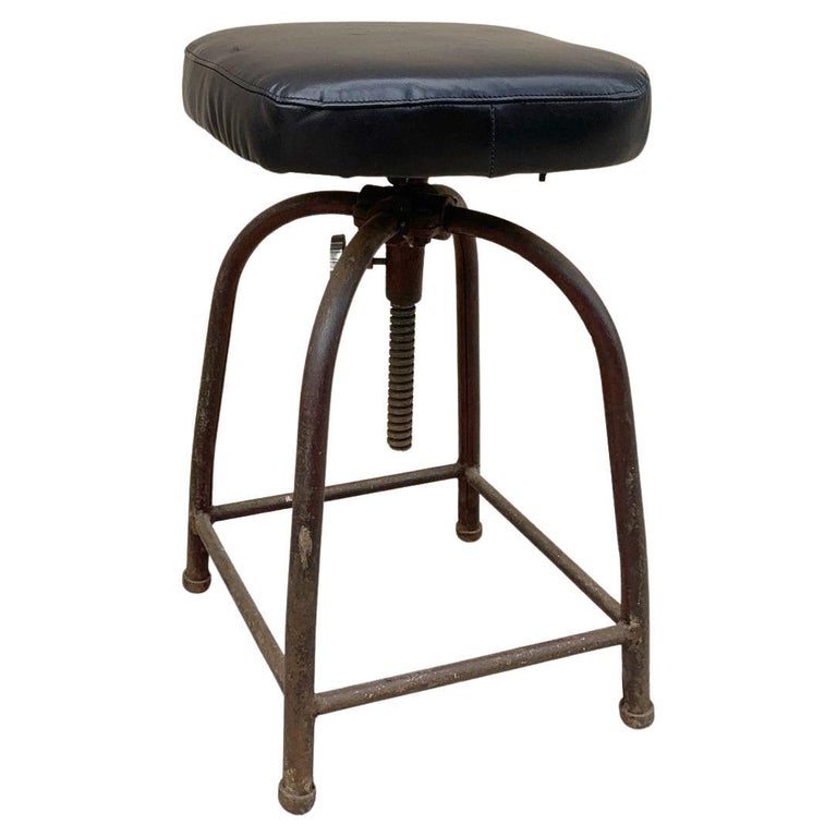 Industriële leren en ijzeren draaikruk uit de jaren 1930-1940. De maximale hoogte is 75 cm of 29,5 inch. Het leer is oude herstoffering en is in goede staat. Subtiele patina en zeer comfortabel. Het strijkijzer heeft een vervaagde oude verflaag.