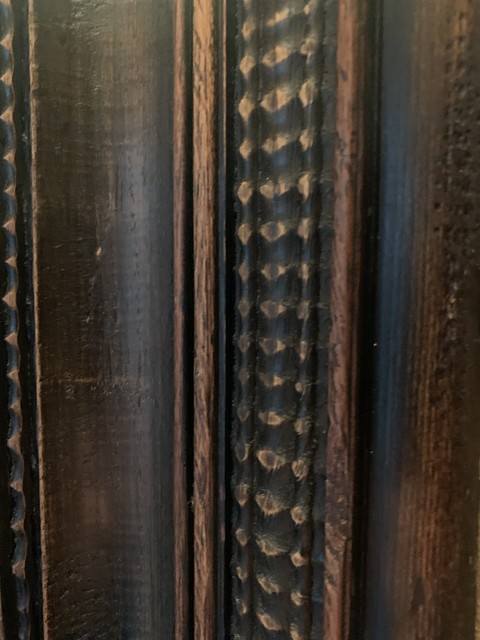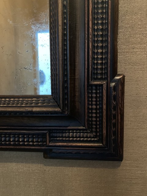 Een 19e-eeuwse gezwarte Italiaanse spiegel in klassieke 17e-eeuwse stijl. Gemaakt van naaldhout, fijn gevormd en gedecoreerd. Originele spiegel, zachte patina.