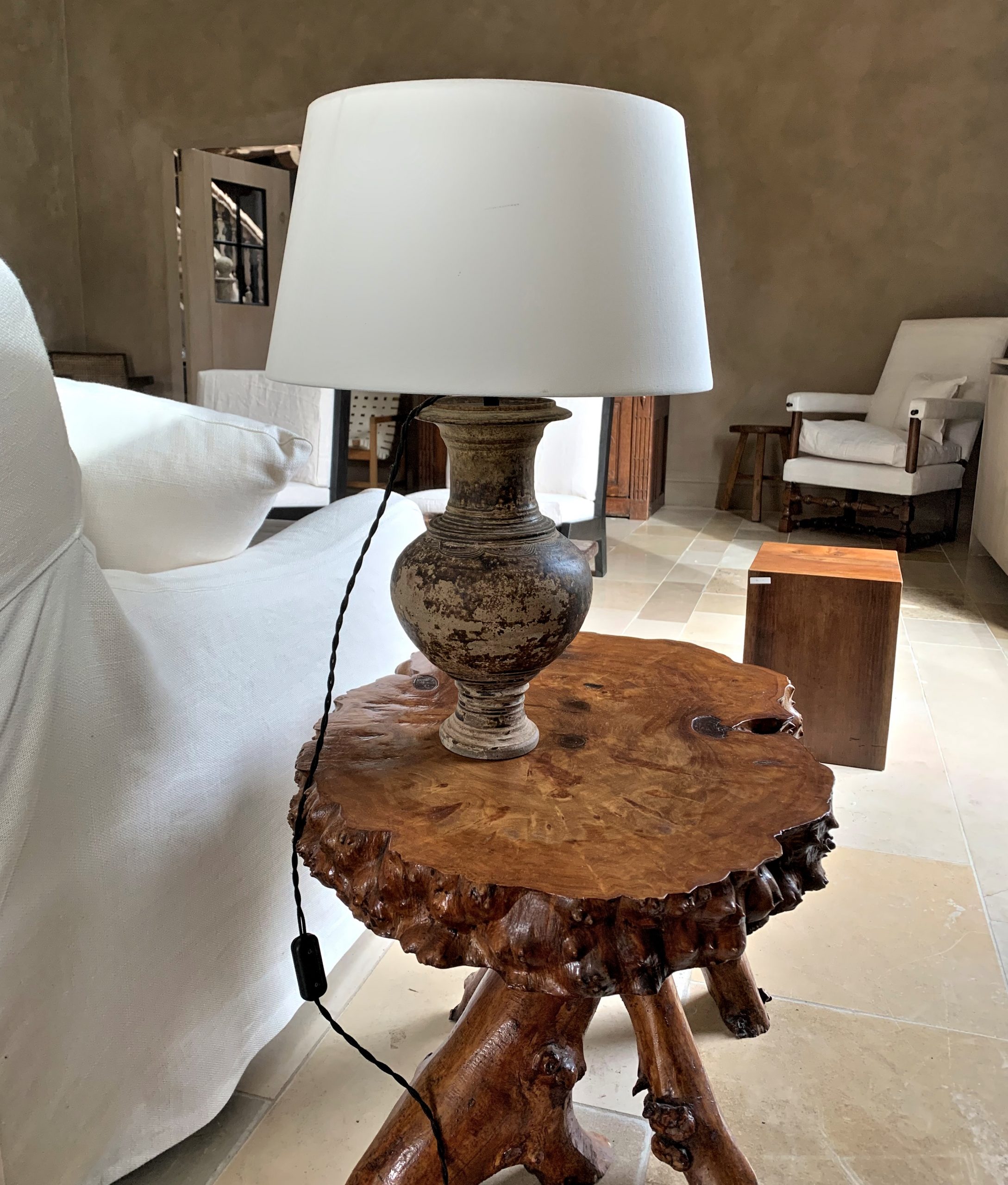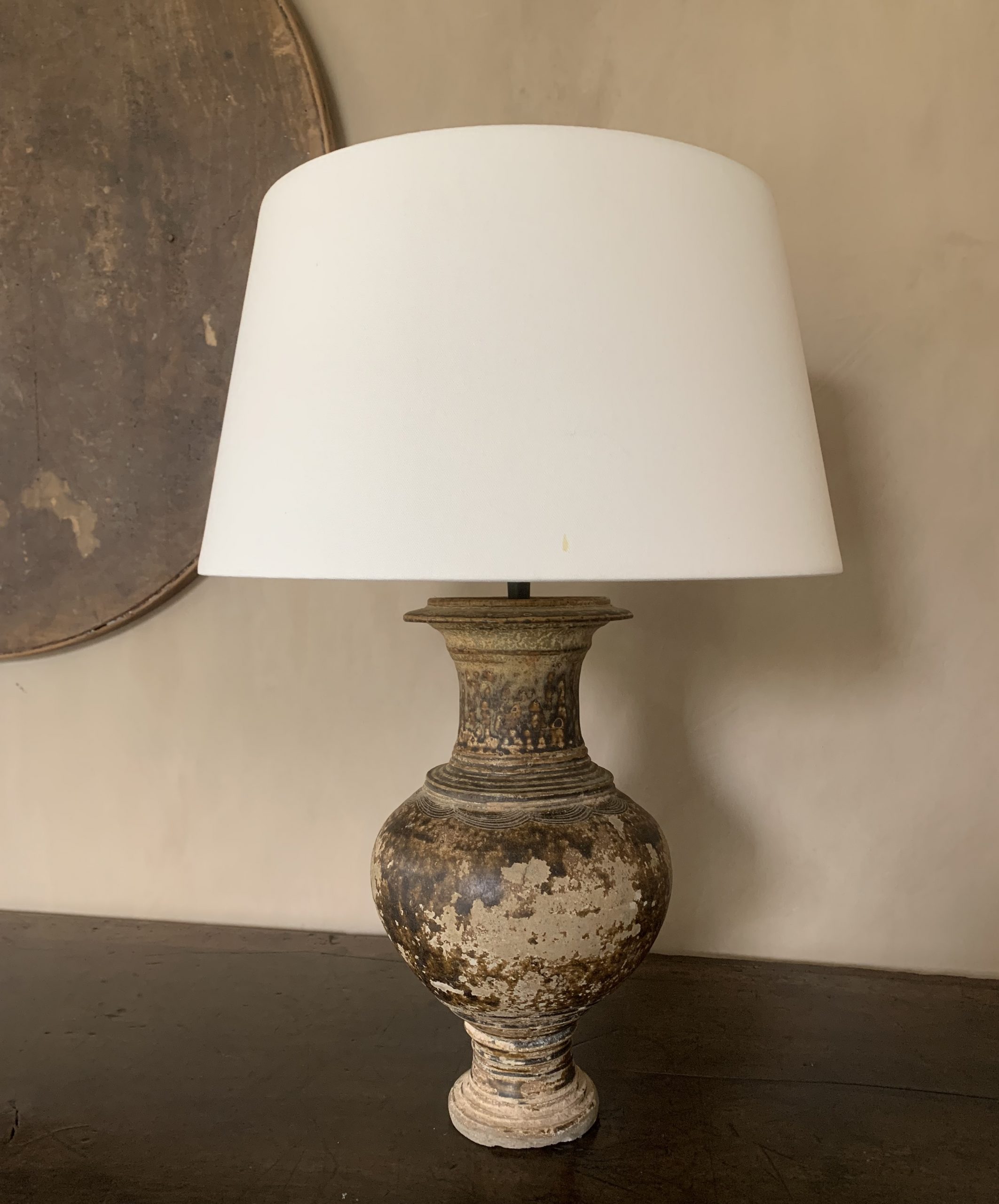 In ons atelier werd deze vaas omgetoverd tot tafellamp. De bedrading niet in de vaas geboord maar aan de fitting bevestigd.