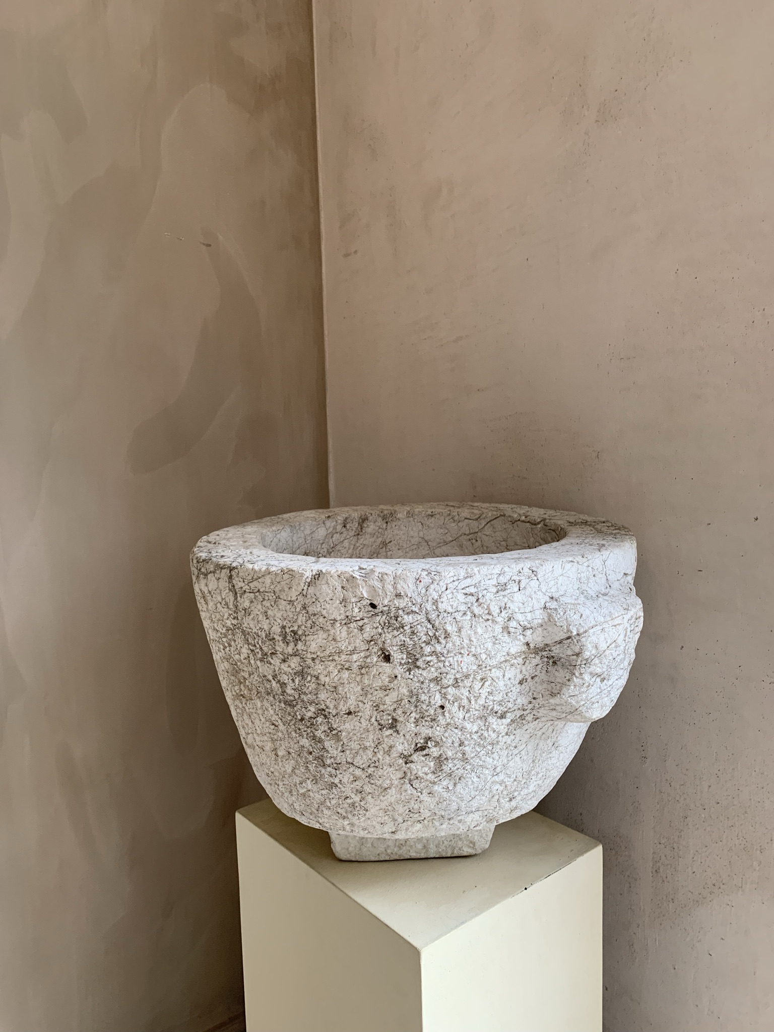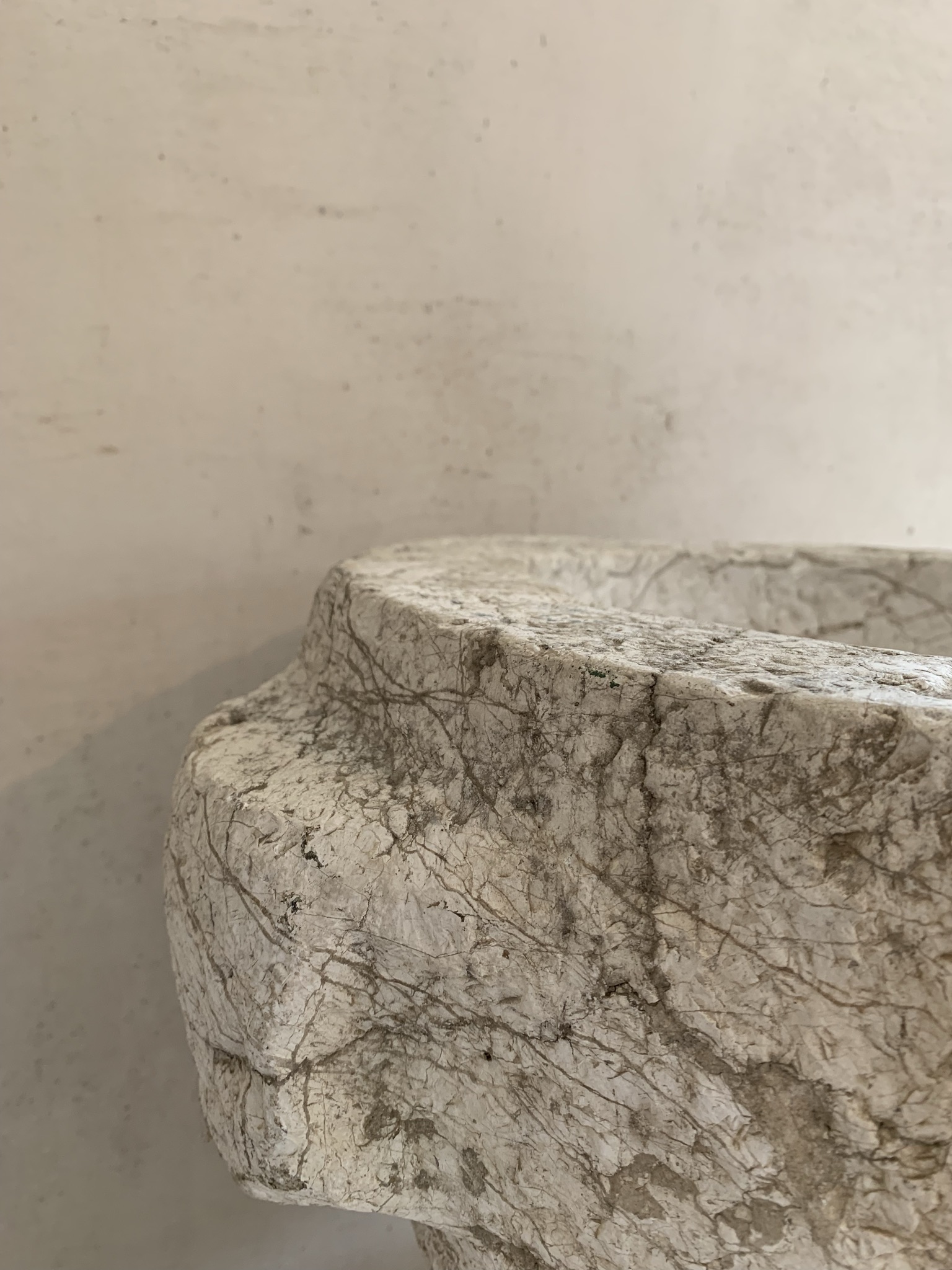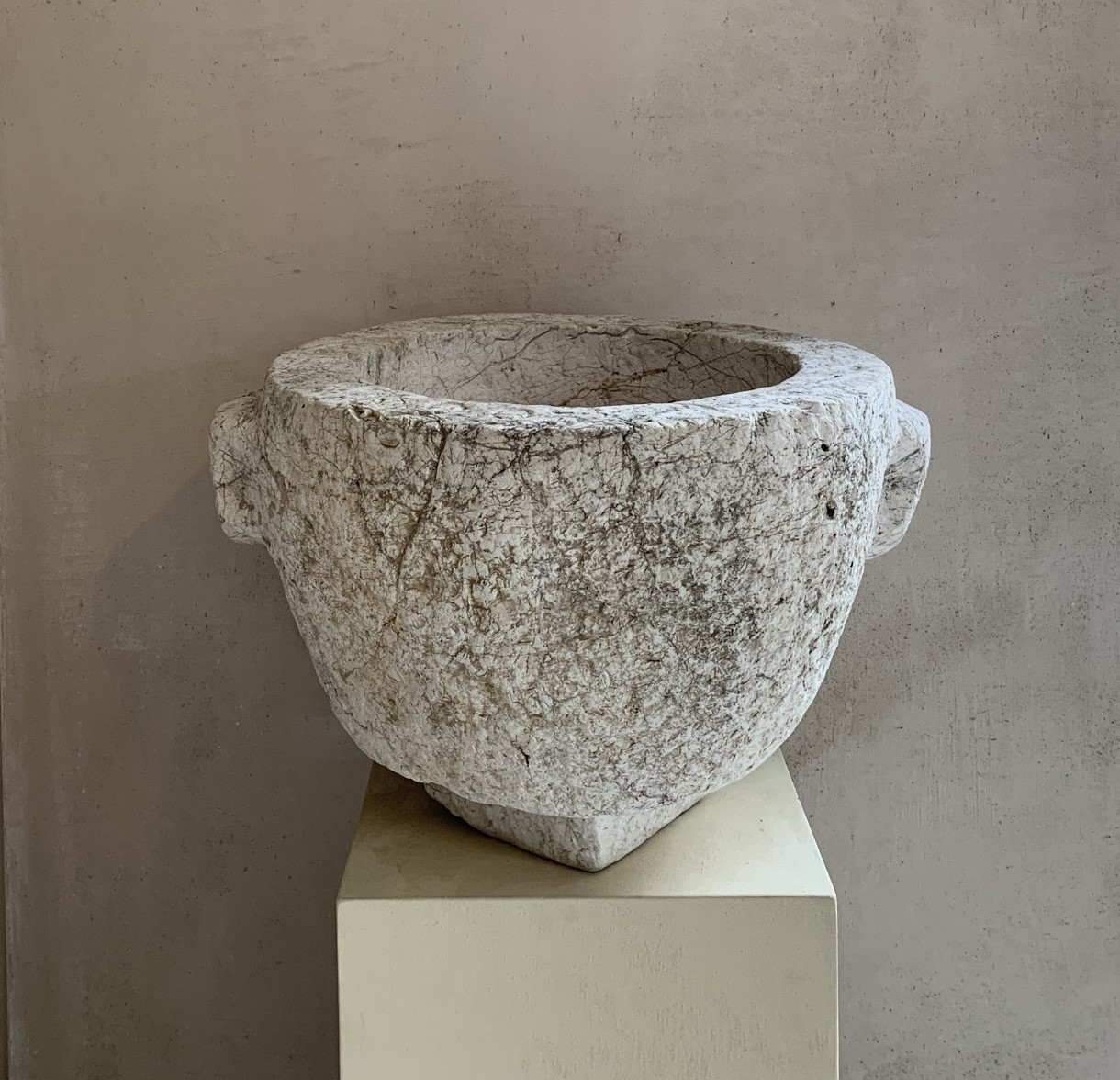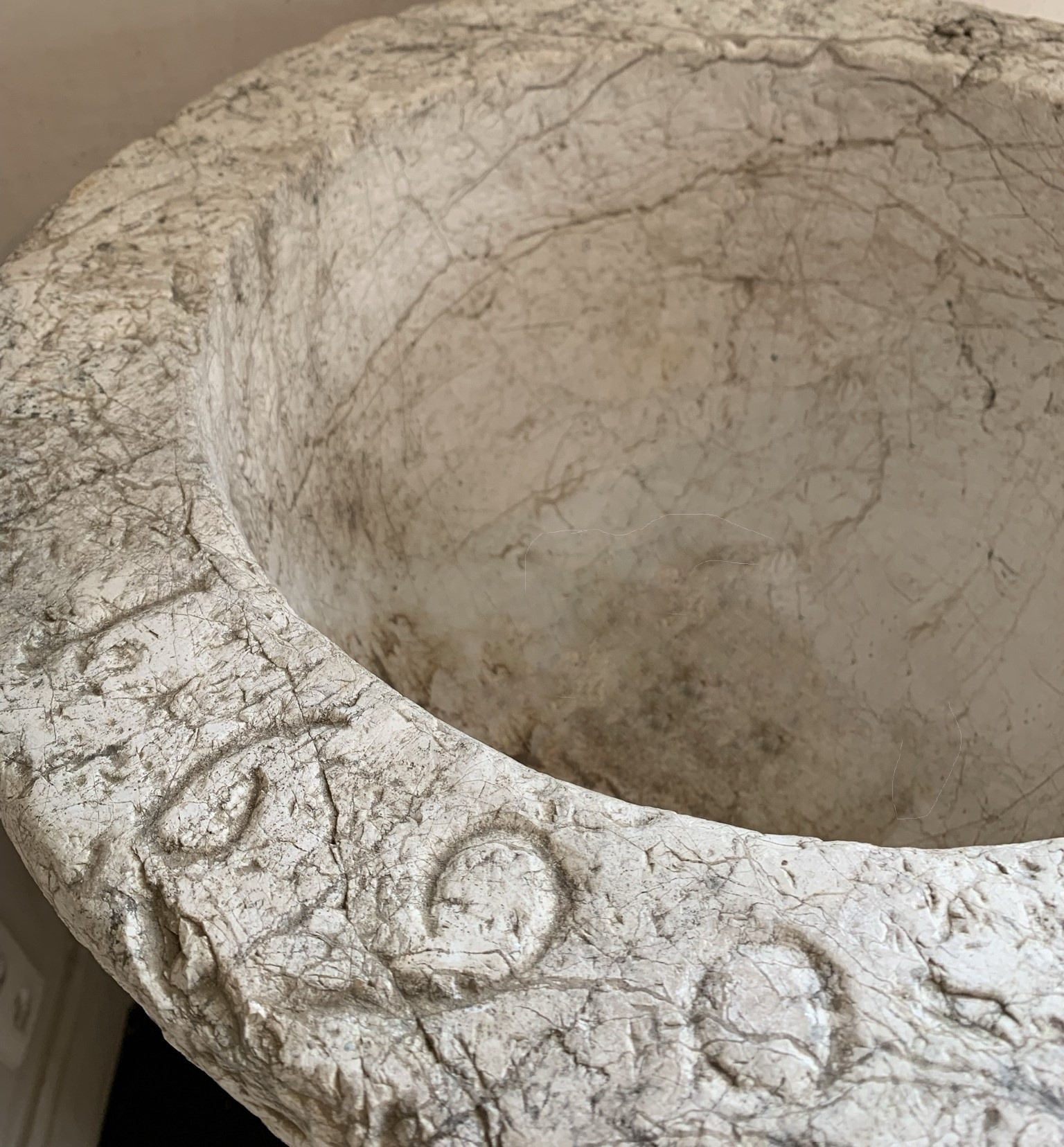 Zeer grote 17e eeuwse vijzel in een prachtig geaderde witte steen. Datum 1690 gebeeldhouwd in de rand. Grote proporties met een bijpassende gebeeldhouwde basis. 55 x 55 x 37 hoog, ref. 1850