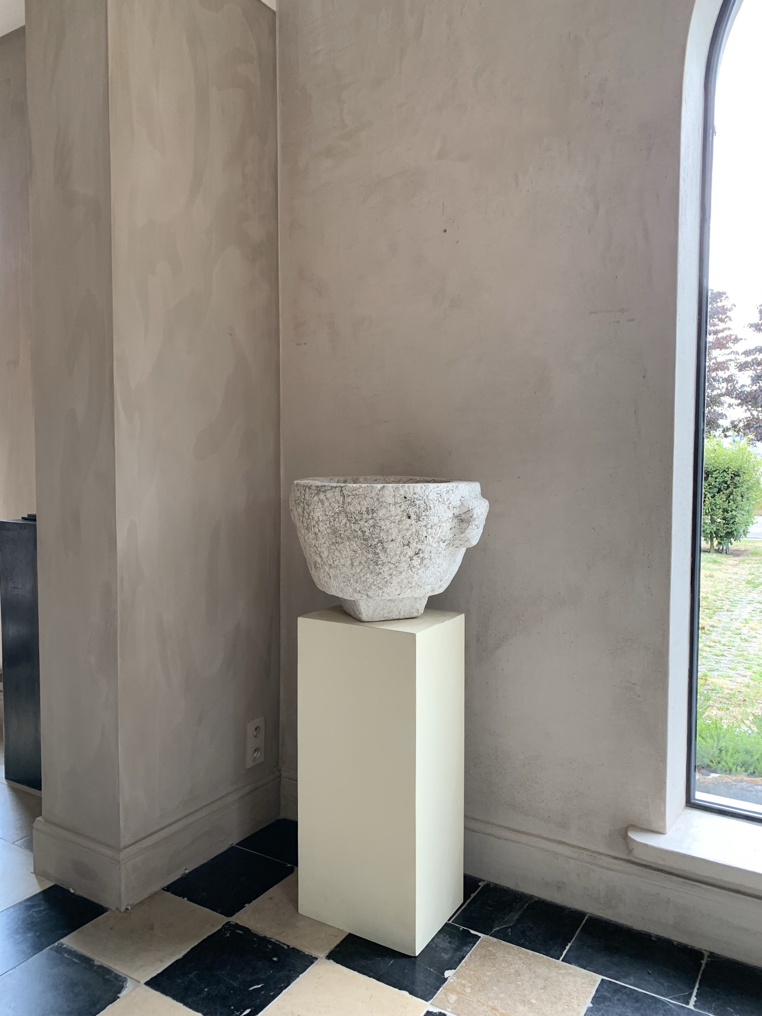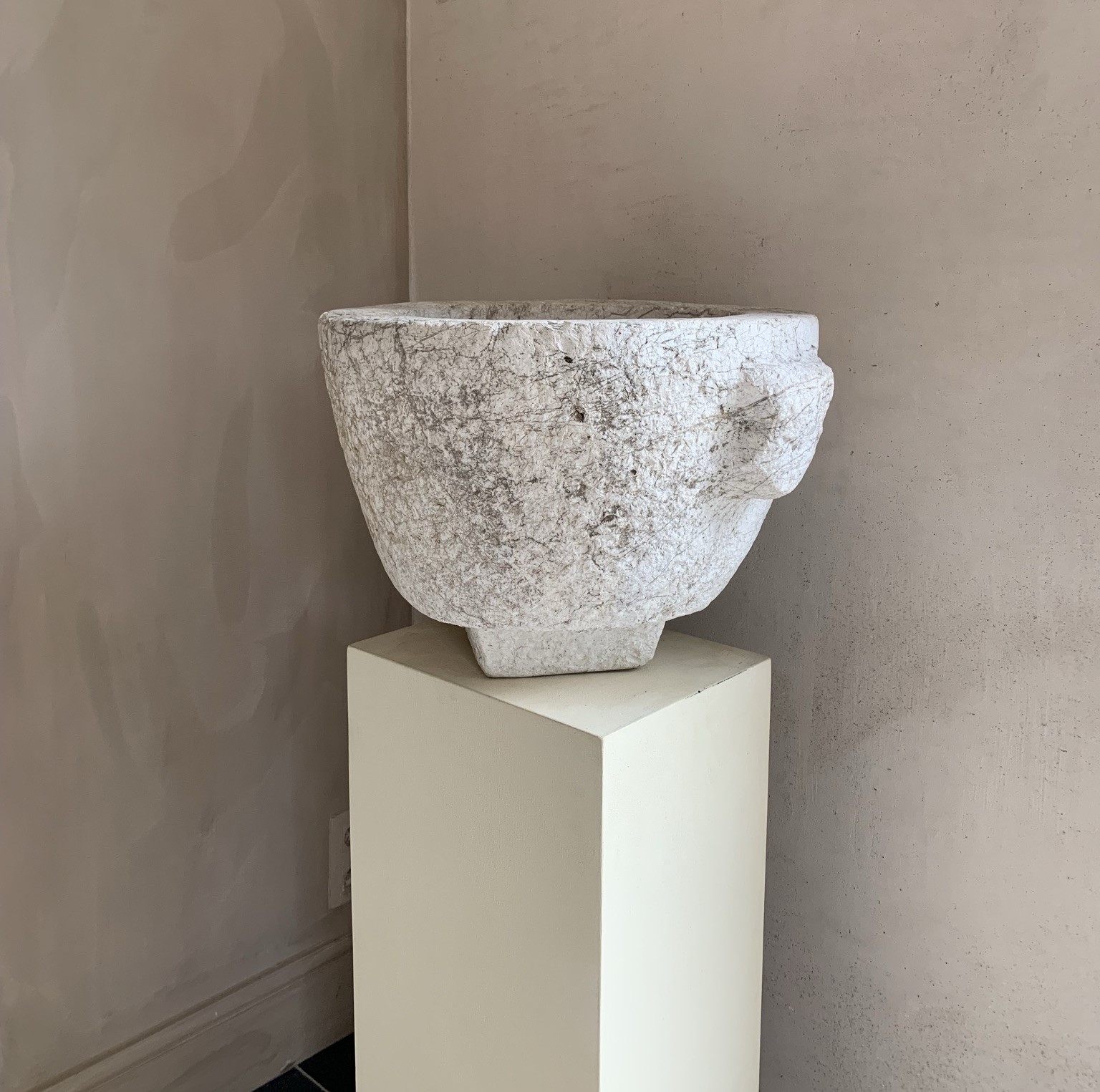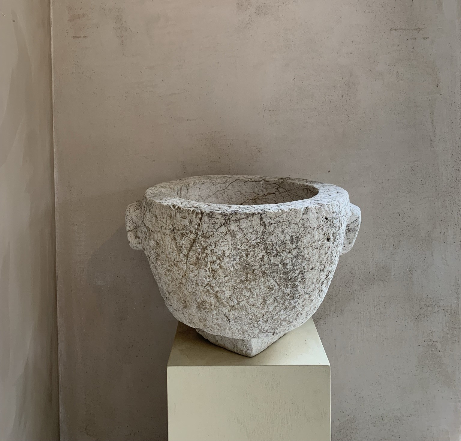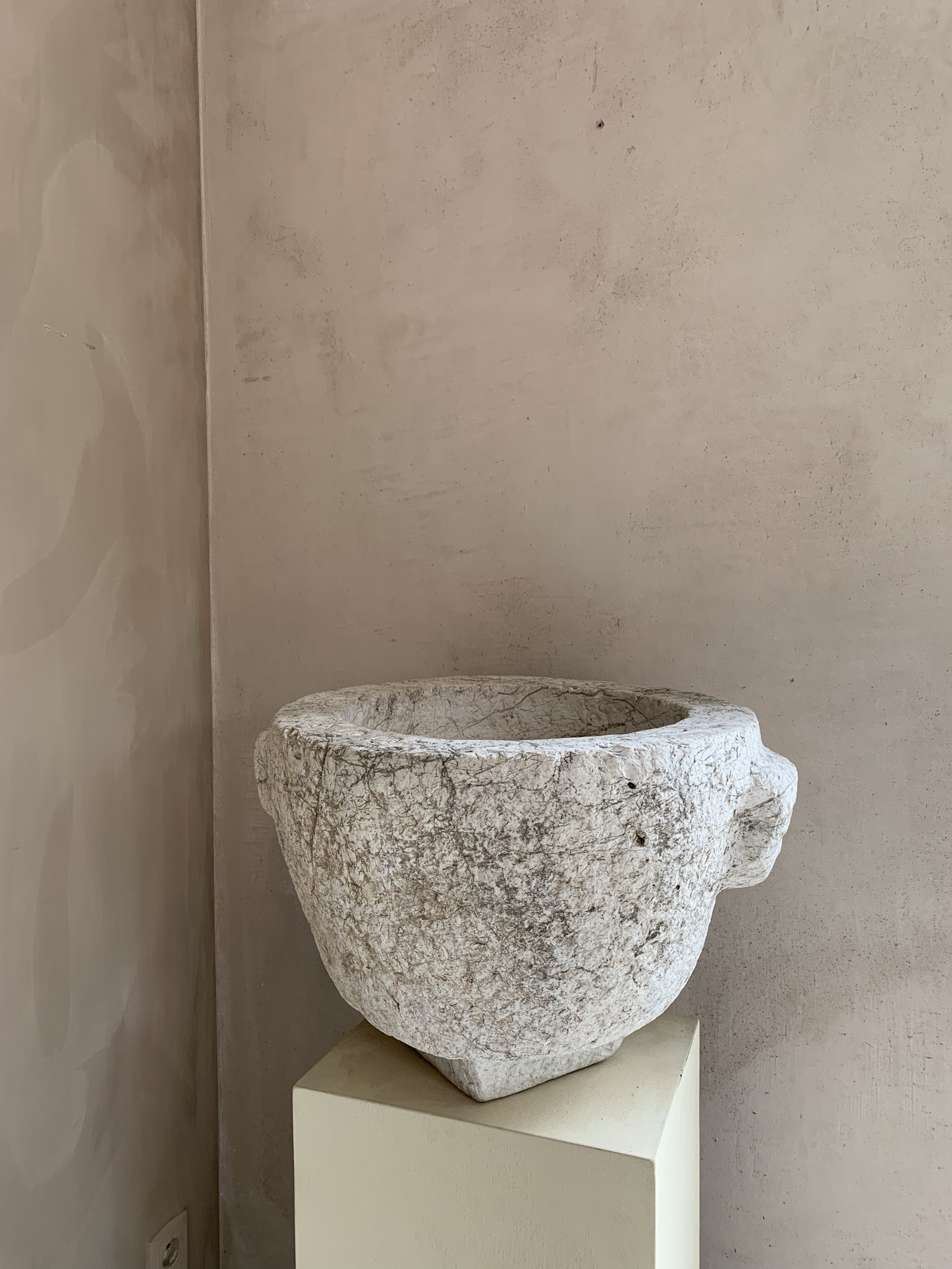 Zeer grote 17e eeuwse vijzel in een prachtig geaderde witte steen. Datum 1690 gebeeldhouwd in de rand. Grote proporties met een bijpassende gebeeldhouwde basis. 55 x 55 x 37 hoog, ref. 1850