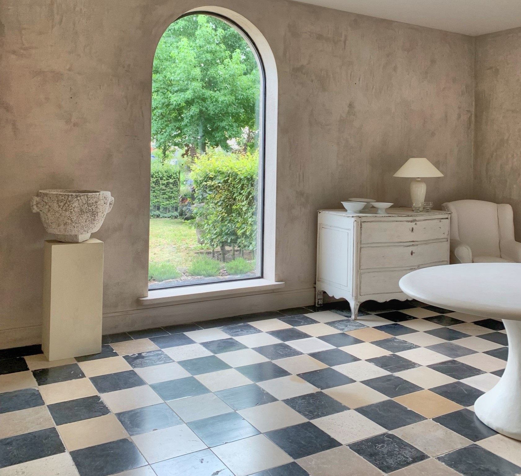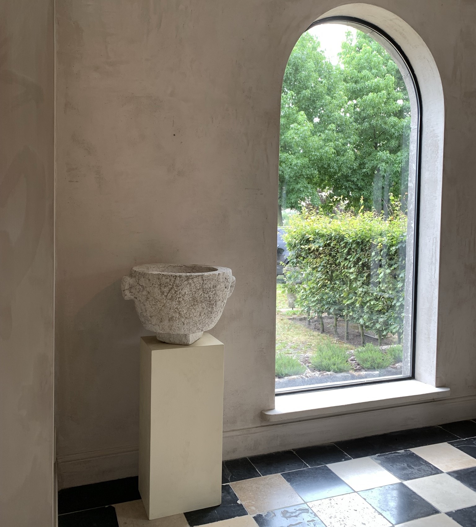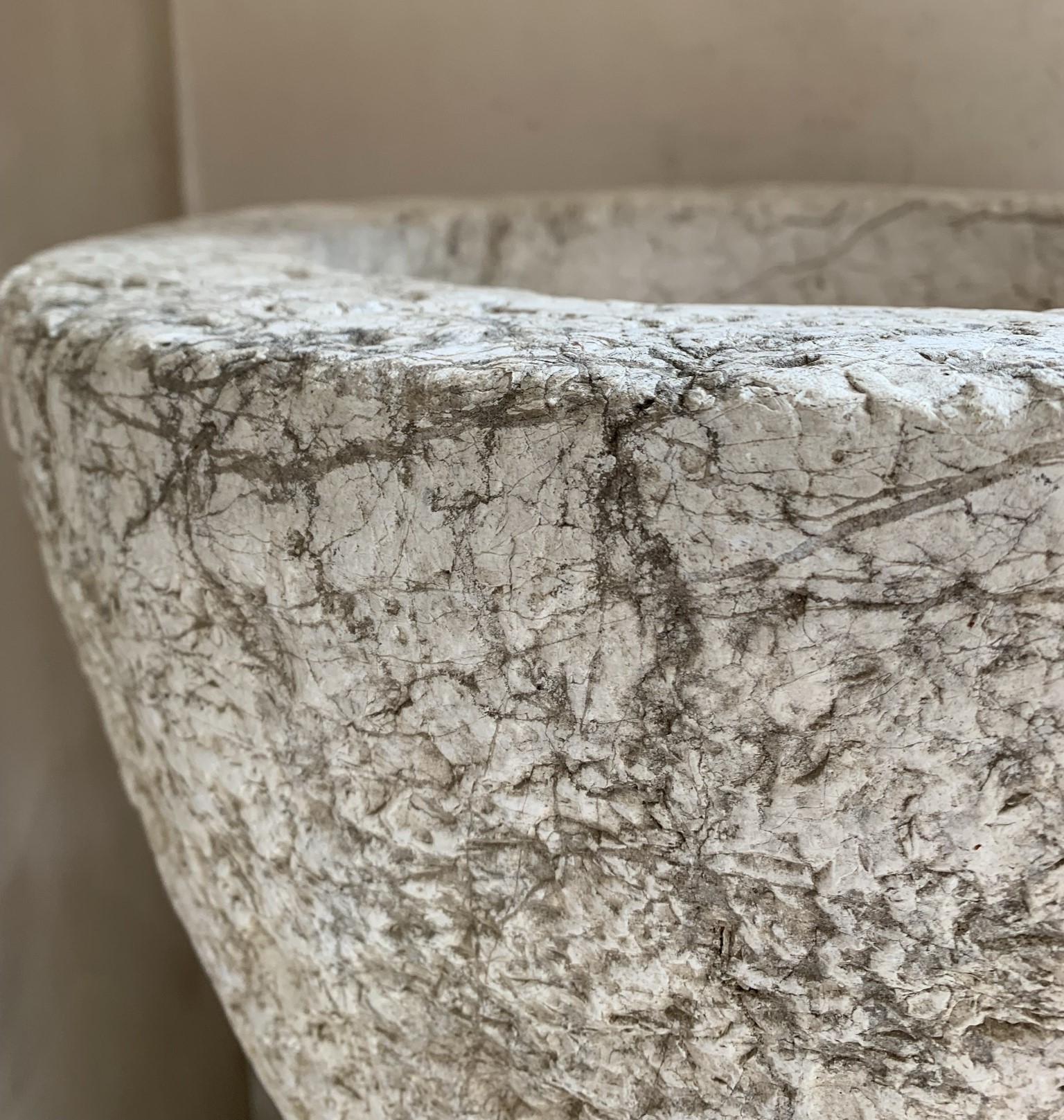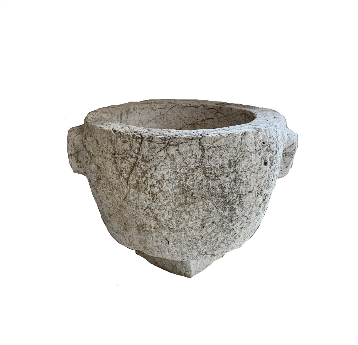 Zeer grote 17e eeuwse vijzel in een prachtig geaderde witte steen. Datum 1690 gebeeldhouwd in de rand. Grote proporties met een bijpassende gebeeldhouwde basis. 55 x 55 x 37 hoog, ref. 1850