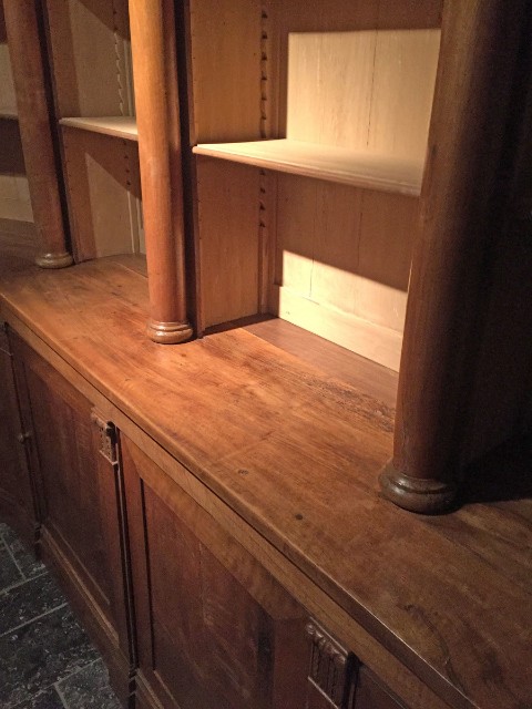 Een zeldzaam paar heliocodale Franse Directoire bibliotheekboekenkasten in massief walnoot. Dit type boekenkast staat ook wel bekend als 'boiseries de Bibliothèque' zoals ze vaak samen met betimmering en een schoorsteenmantel een complete bibliotheekkamer vormden. De gegoten corniche rust op ronde kolommen met gegoten kapitelen die verstelbare zachthouten planken omsluiten met notenhouten frontafronding. De rug in naaldhout en de planken zijn afgewerkt in een lichtbruine organische verf. De sokkels hebben elk vijf deuren geflankeerd door Corintiaanse zuilen en voorzien van de originele houten draaiknoppen. Hun interieurs hebben elk een plank. De stijl van deze boekenkasten situeert zich aan het einde van de Directoire en het begin van de Empire-periode, rond 1800. Ze werd gemaakt door een meestervakman in de regio Toulouse en had naar verluidt zijn herkomst in een plaatselijk herenhuis. De basisafmetingen vindt u in de meegeleverde indelingen. Deze boekenkasten zijn elk demontabel in 4 stuks en de losse kolommen. Desgewenst kunnen we een aanbieding doen om dit stuk wereldwijd te installeren.