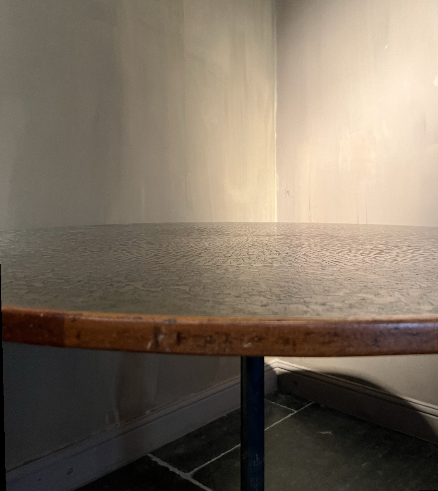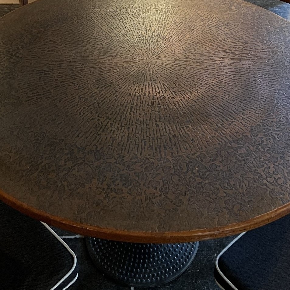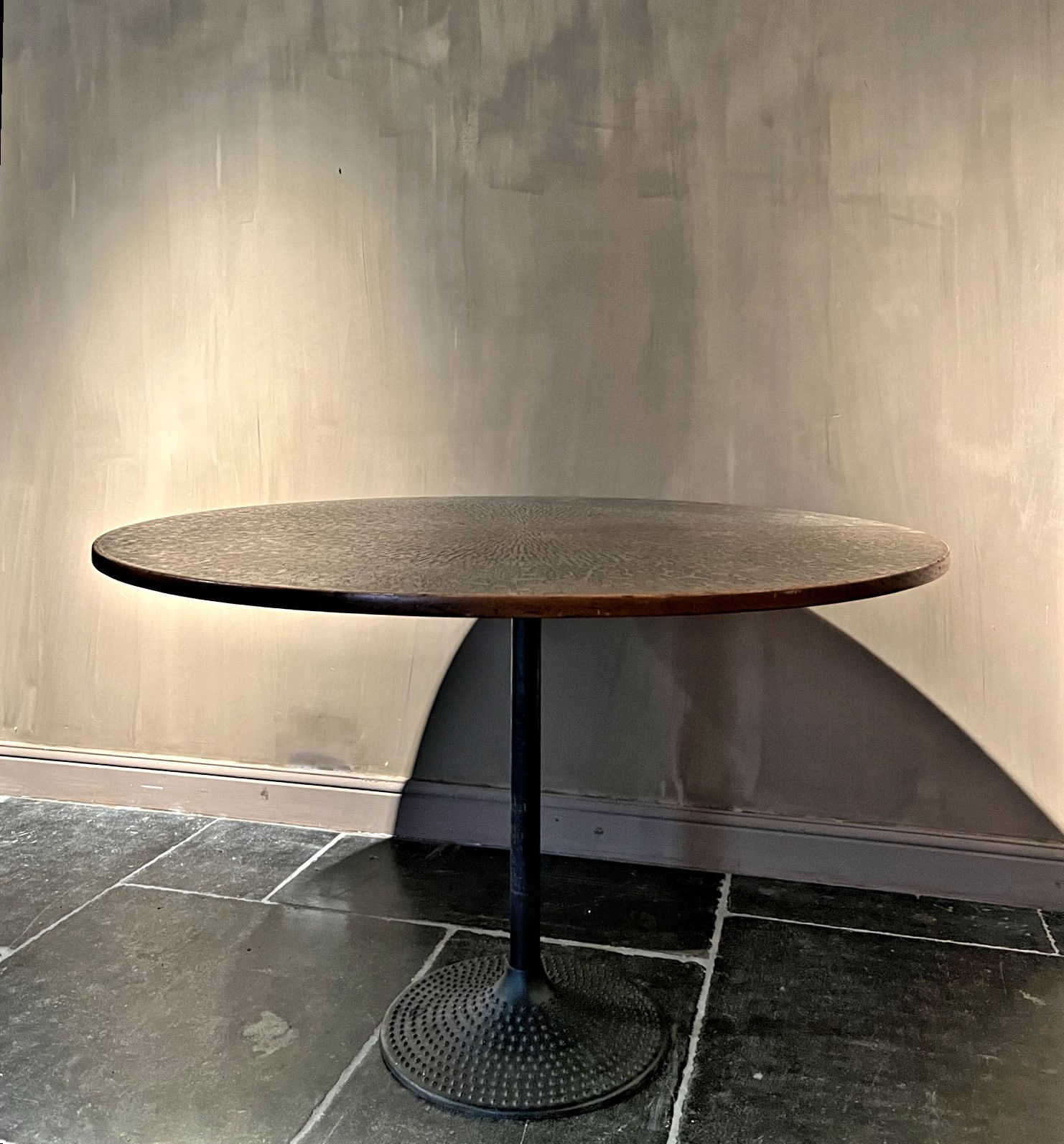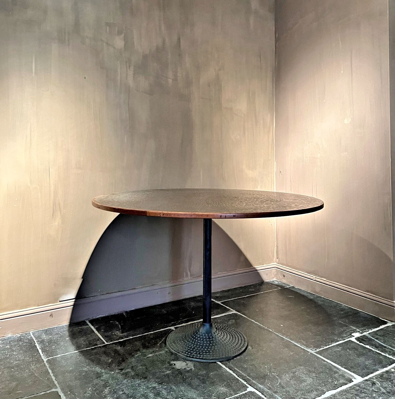 Grote Scandinavische midcentury ronde tafel met koperen blad in reliëf op een gecoat ijzeren onderstel. 119 diam x 76 uur, ref. 2005