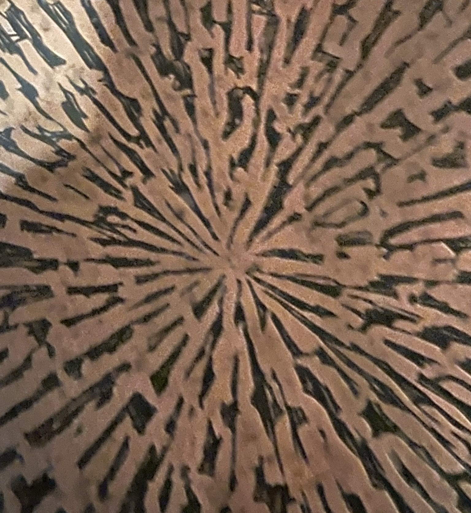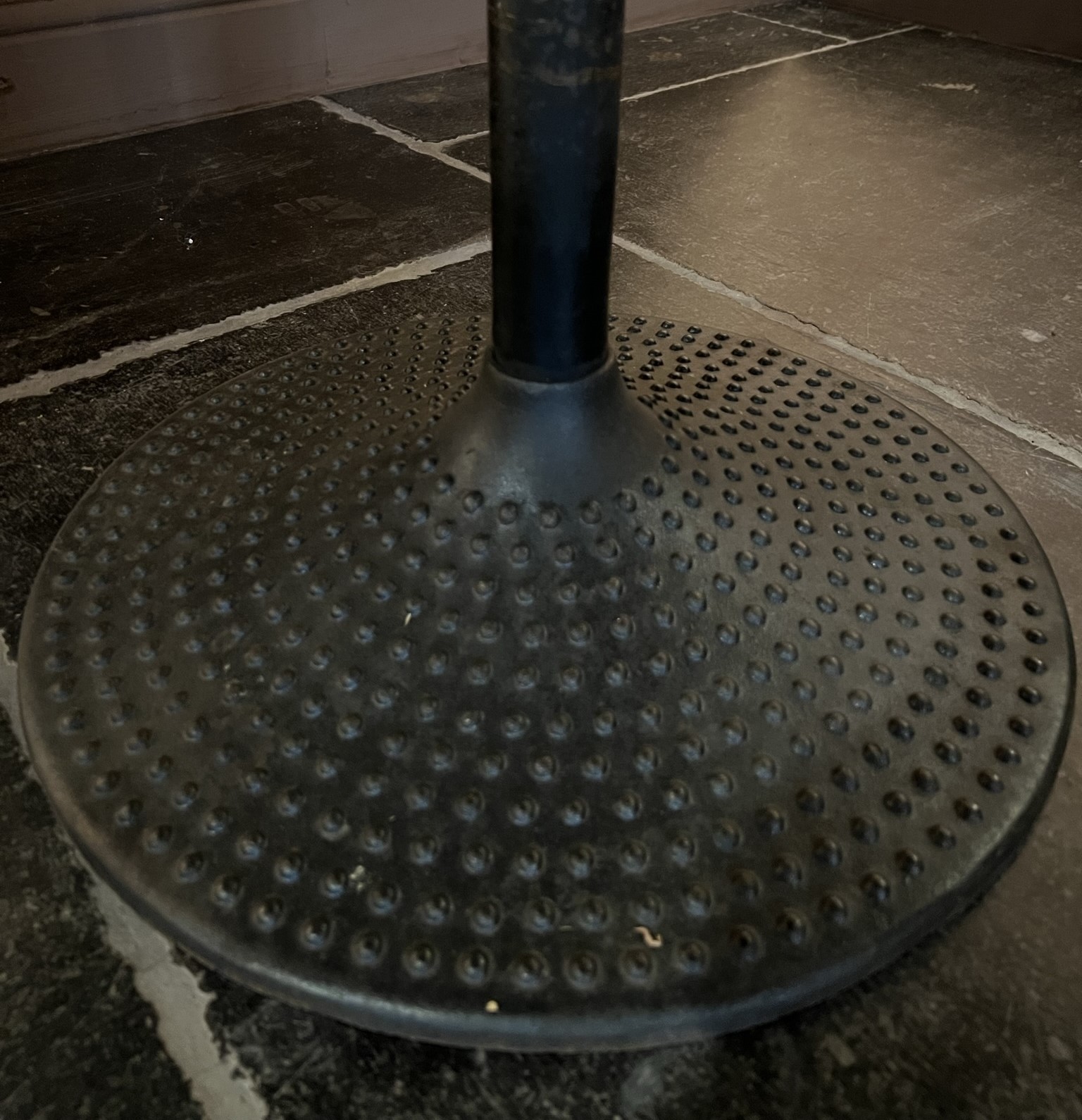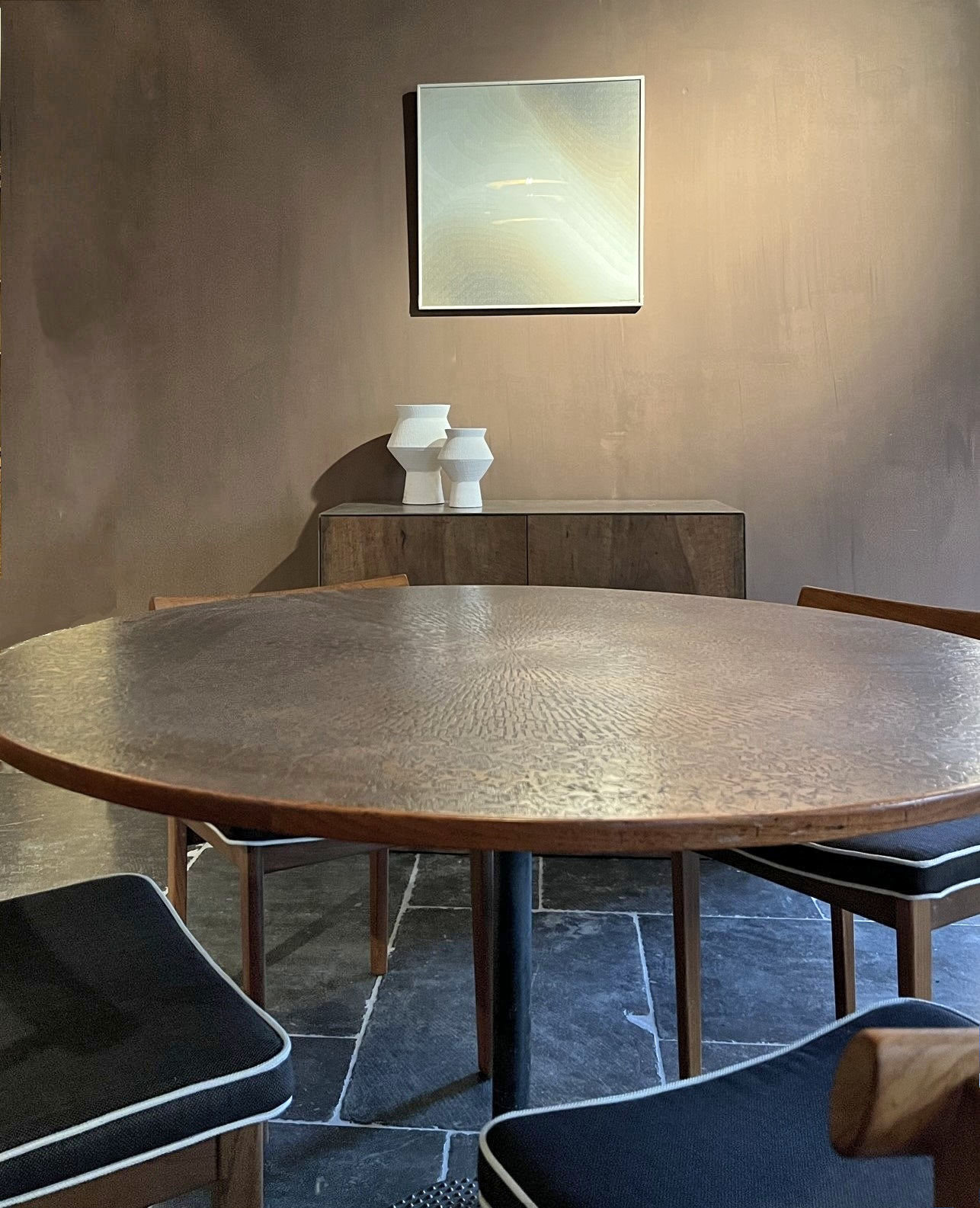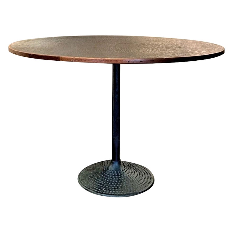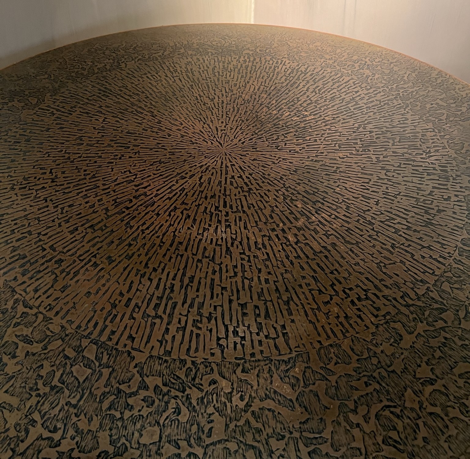 Grote Scandinavische midcentury ronde tafel met koperen blad in reliëf op een gecoat ijzeren onderstel. 119 diam x 76 uur, ref. 2005