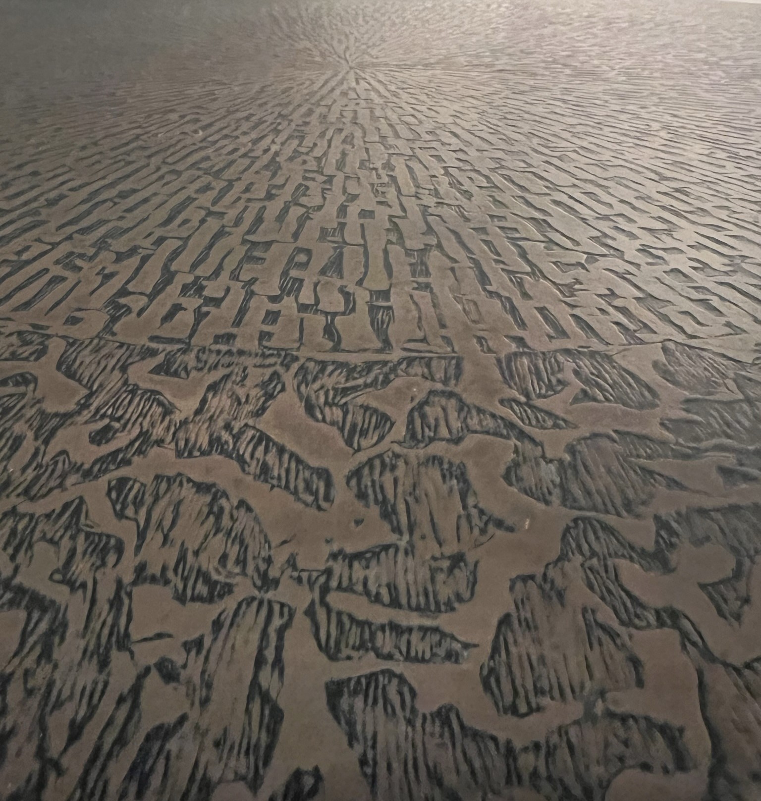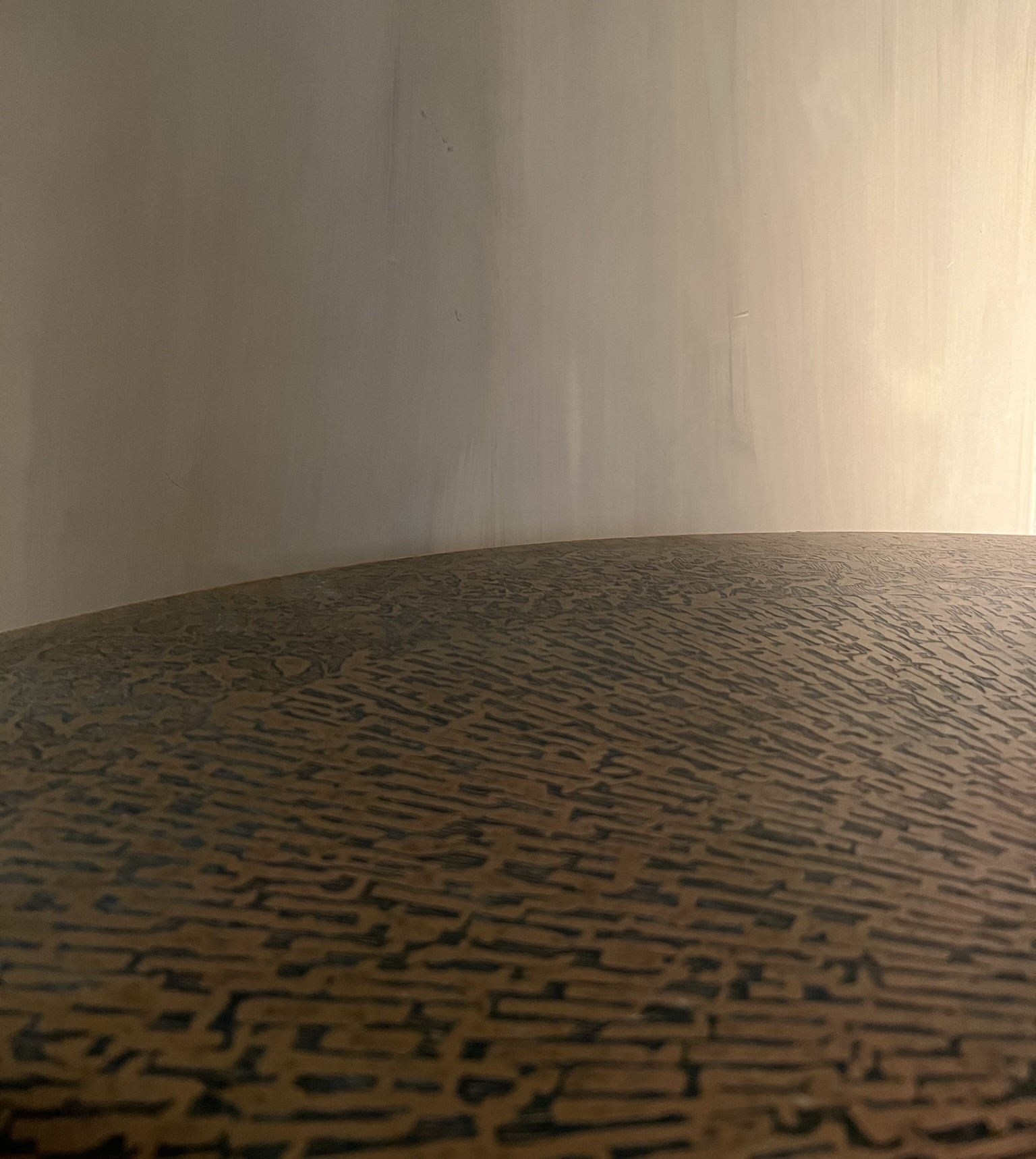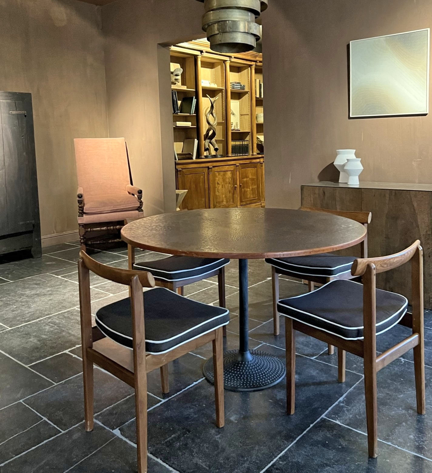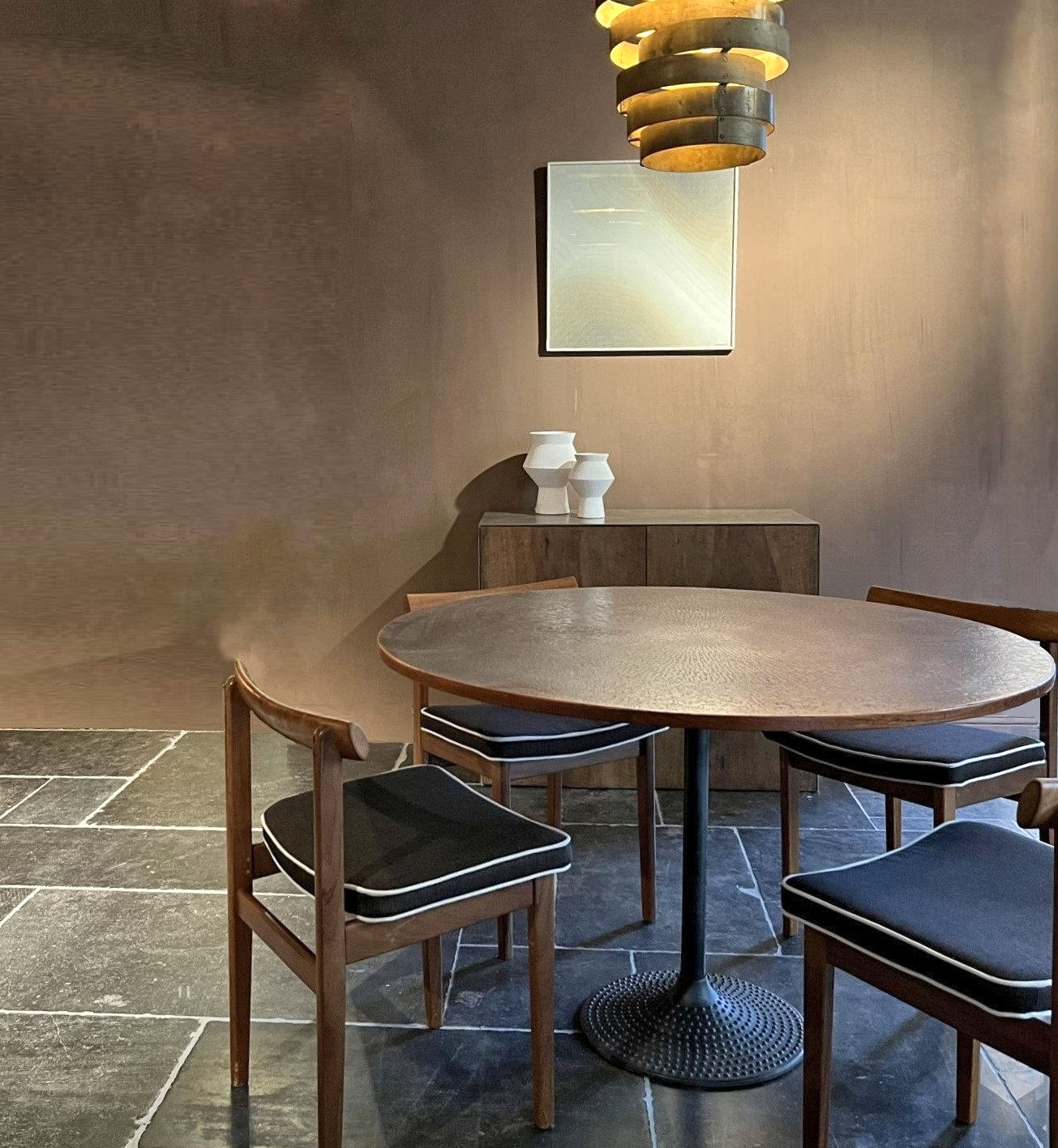 Grote Scandinavische midcentury ronde tafel met koperen blad in reliëf op een gecoat ijzeren onderstel. 119 diam x 76 uur, ref. 2005