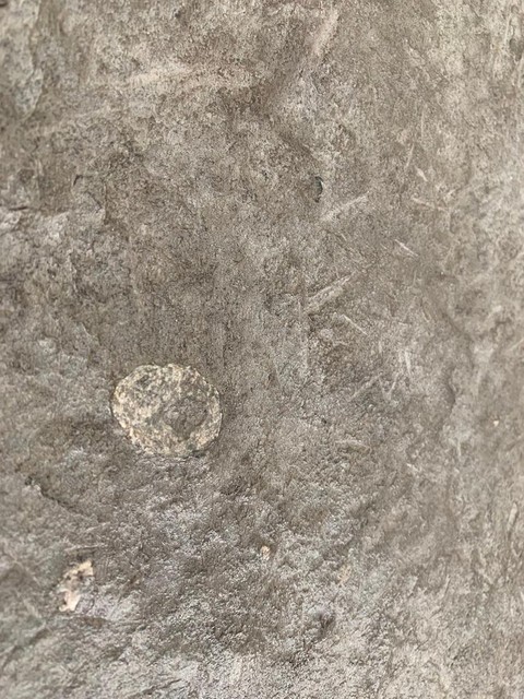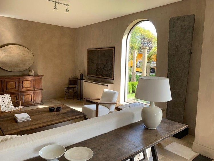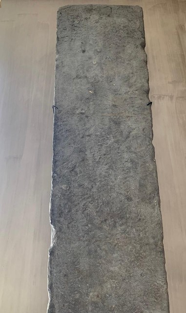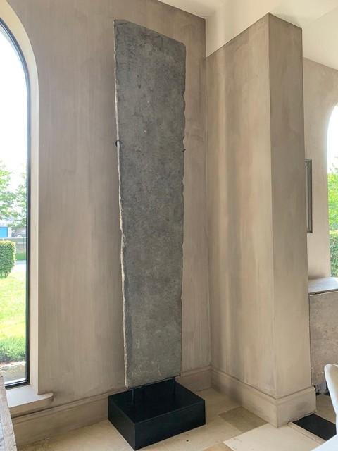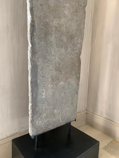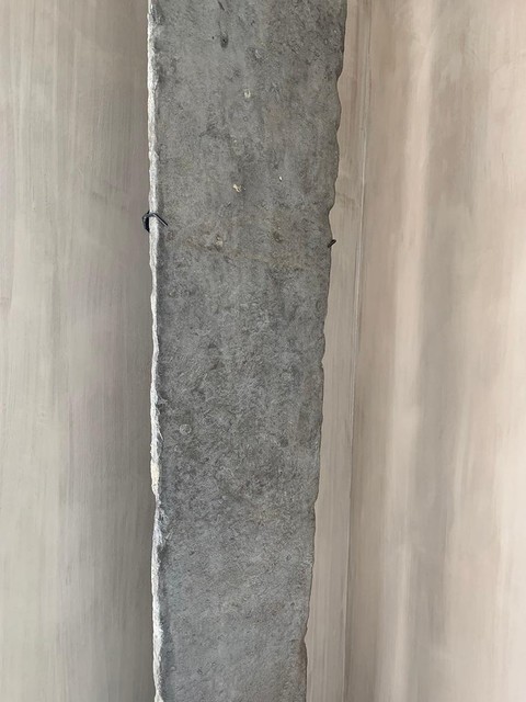 Een 15e-eeuwse Franse gerecupereerde vloerplaat van enorme proporties. Vanwege zijn schoonheid, ongebruikelijke grootte en de rijkdom aan fossielen hebben we besloten om dit stuk als sculptuur op te hangen. We vonden het onder een 17e-eeuwse bordeauxrode vloer in een landhuis met wortels in de middeleeuwen. De hoofdschoorsteen werd uit de achterkant van het origineel gebeeldhouwd, wat alleen zichtbaar was toen we het eruit haalden, het parket werd op grote populierenhouten planken genageld, enz. Dit huis zat vol verrassingen, zoals dit stuk goed getuigt.