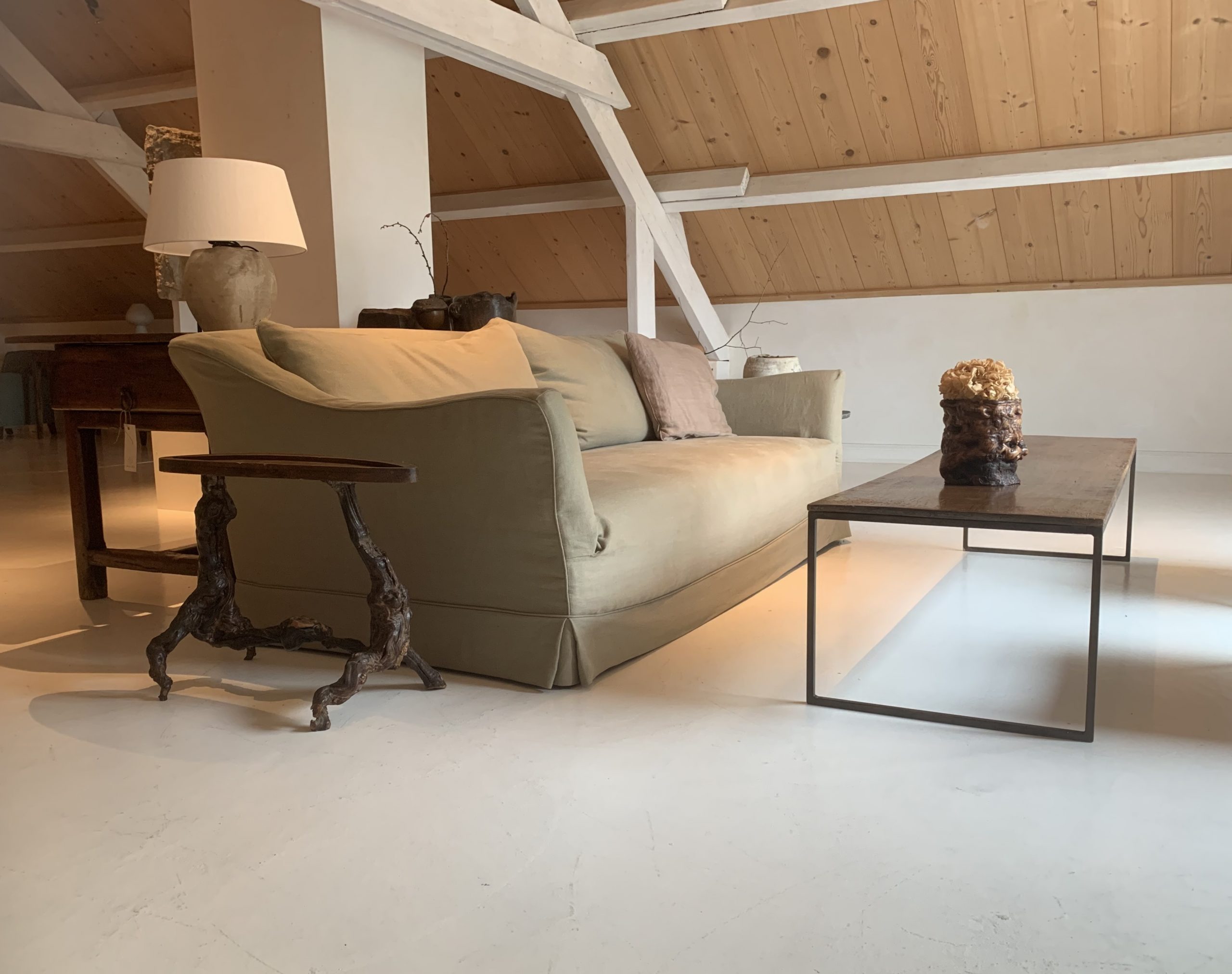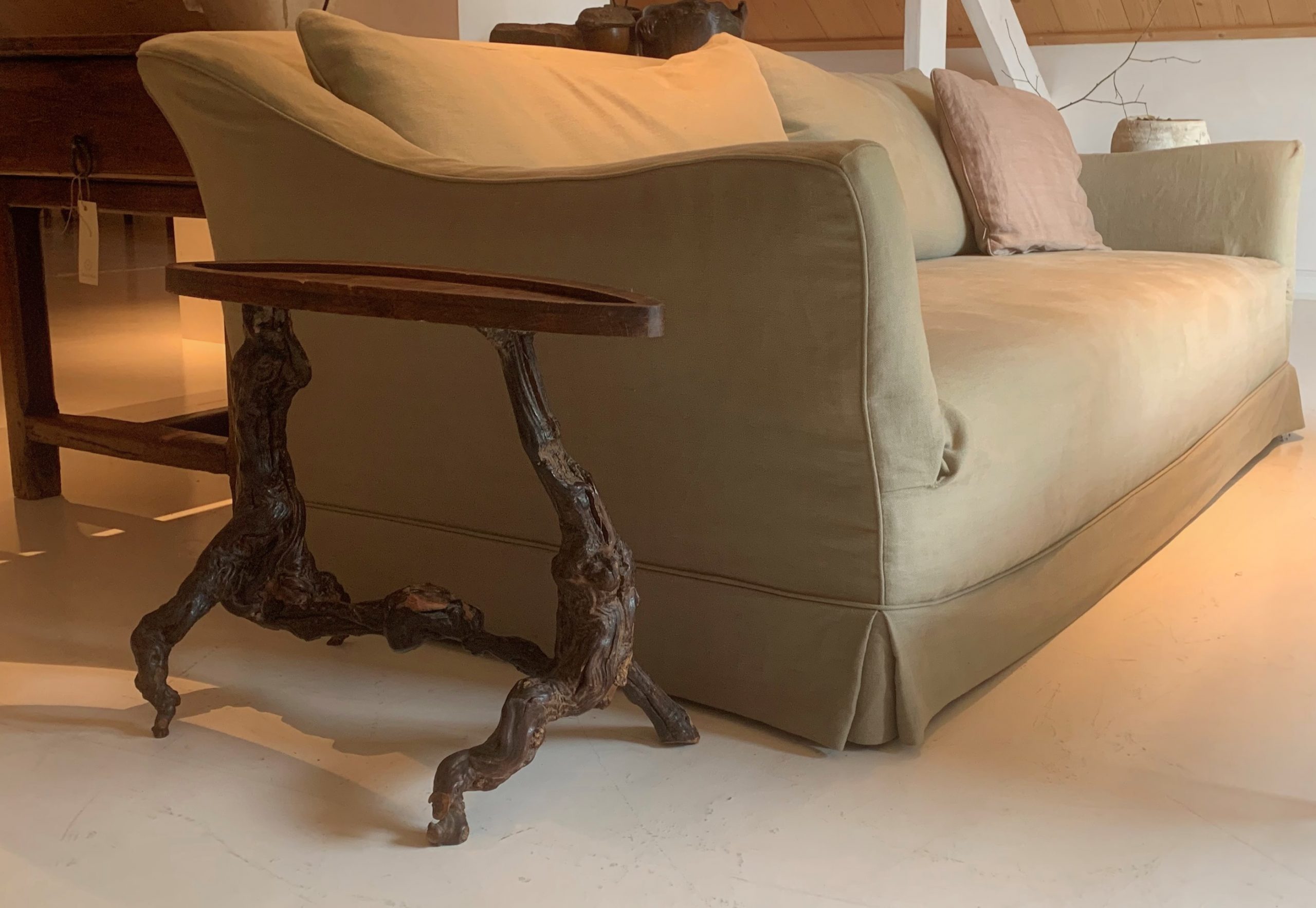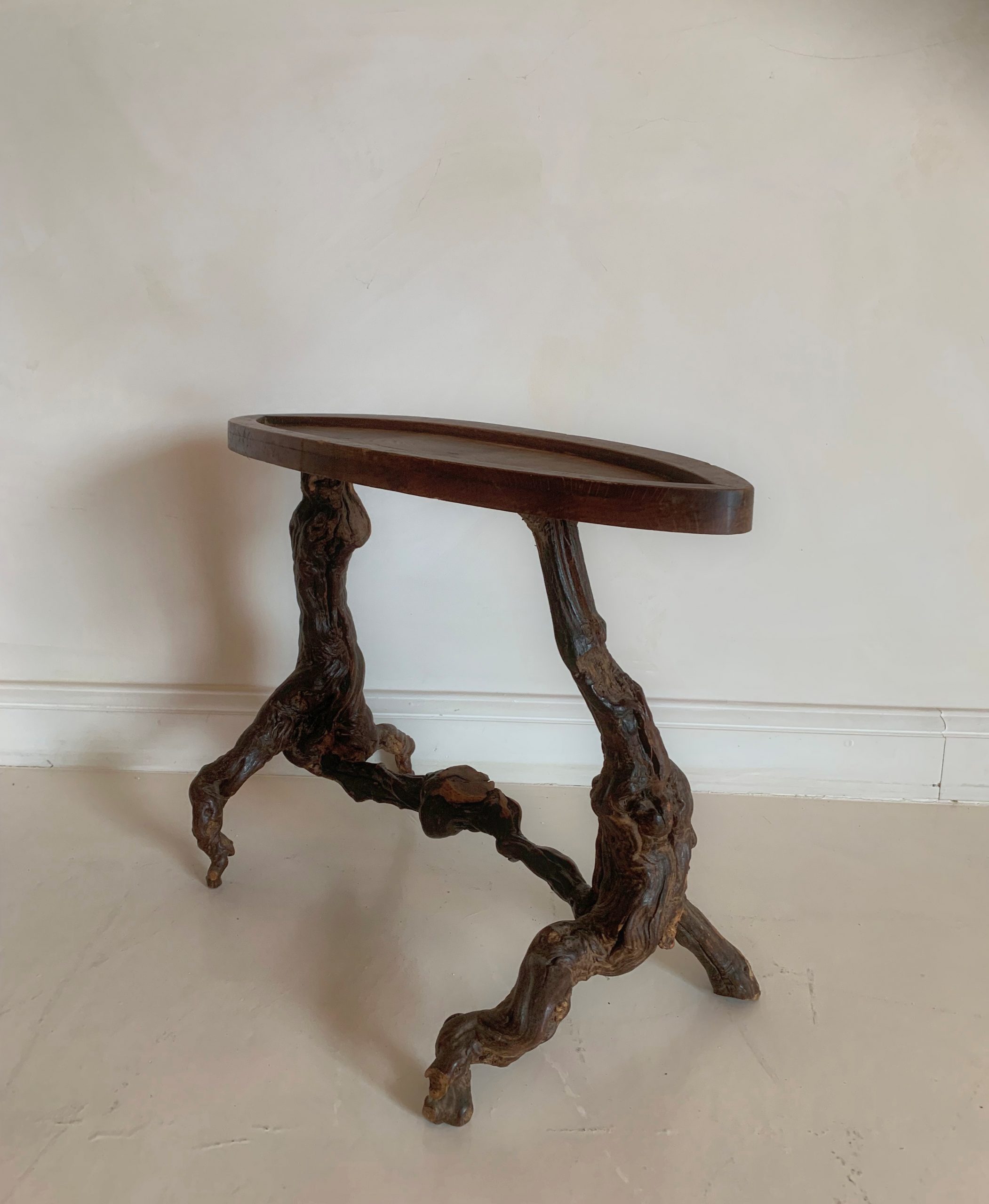 Een klein 19e-eeuws Frans bijzettafeltje gemaakt van eiken en wijntakken. Wijnboeren in de regio Languedoc en Bourgogne gebruikten vroeger het hout van de tot oude wijntakken om meubels, bestek en uiteindelijk de laatste restjes brandhout van te maken. Geen centimeter werd verspild en de lokale klusjesman gebruikte al zijn creativiteit om voorwerpen te maken. Deze eigenzinnige bijzettafel is daar een mooi voorbeeld van en de organische lijnen geven hem een aangename moderniteit.