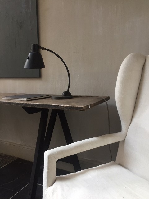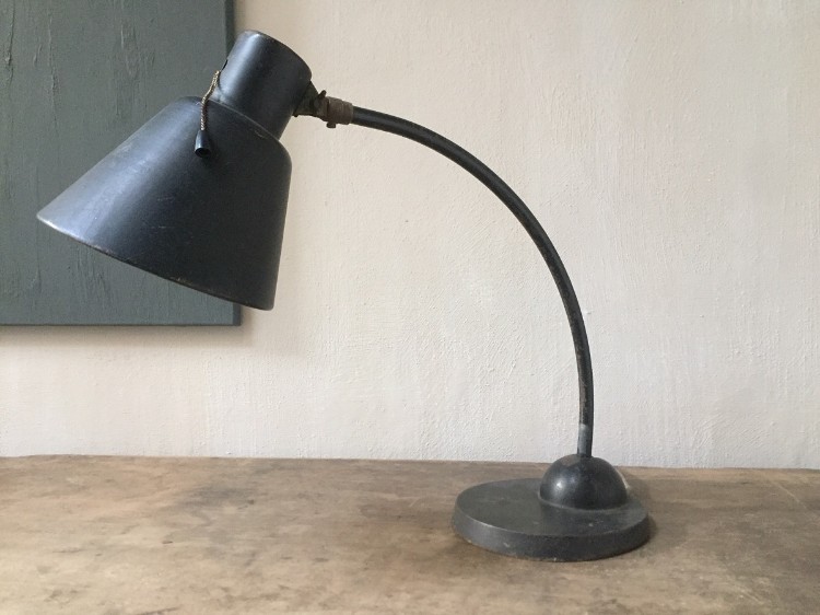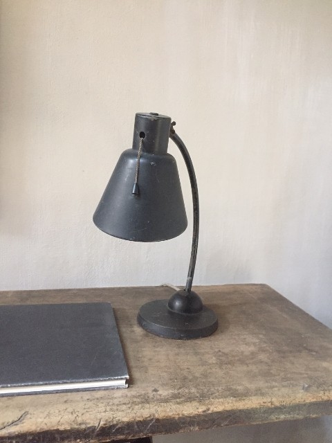 VERKOCHT Een Schaco tafellamp met verstelbare kap en standaard. Schaco was een Duitse fabrikant van industriële verlichting die in de modernistische stijl van die periode werkte. Deze tafellamp is geheel origineel en functioneel. De zwarte lak heeft een mooi patina.