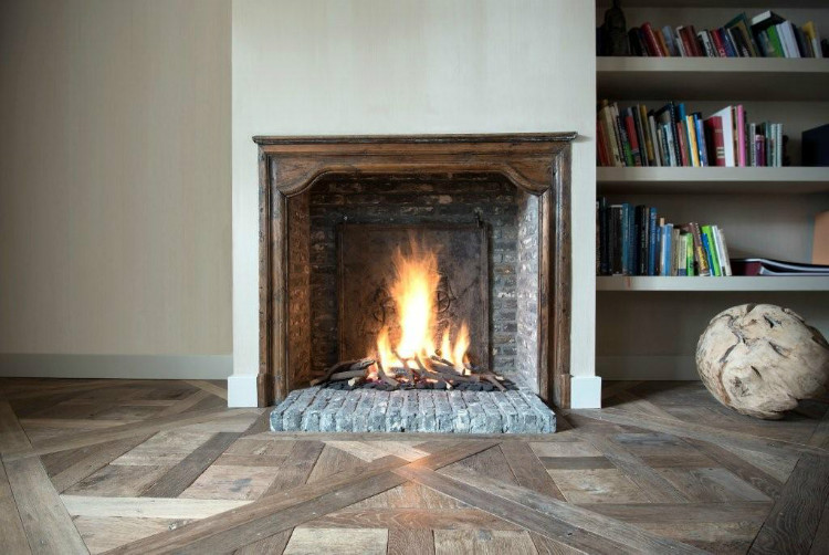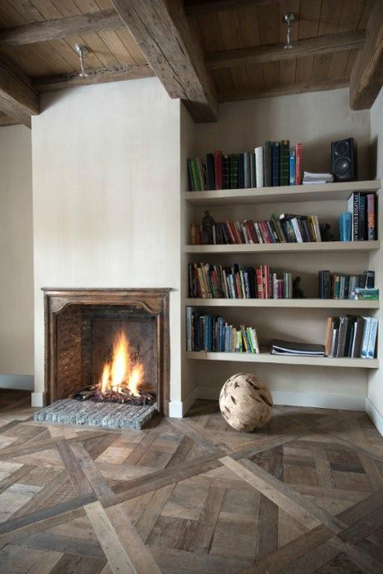 Open haard, parketvloer 'Versailles' en balkenplafond in een bibliotheek ontworpen door Van Beek & Dings interieurarchitecten.