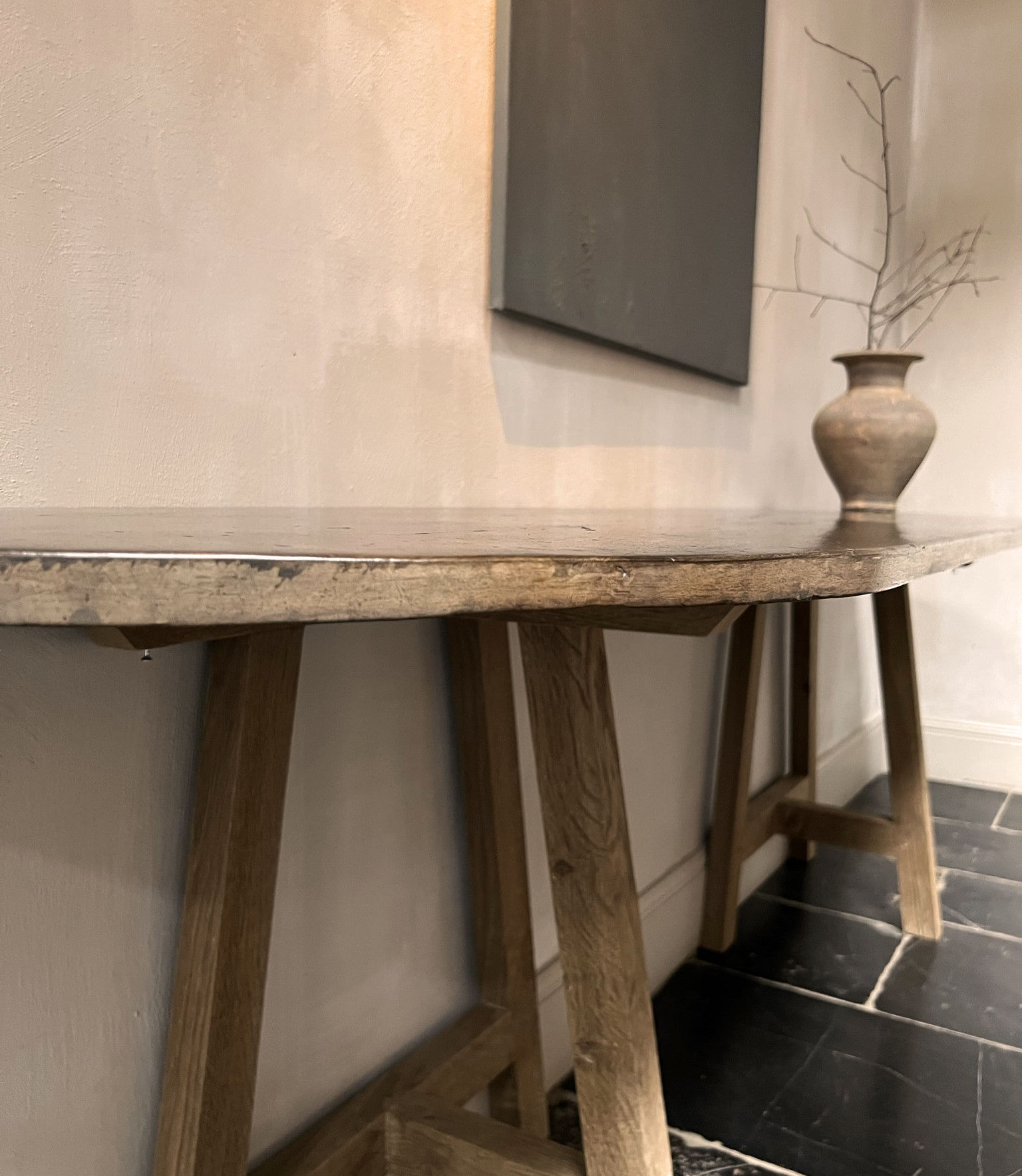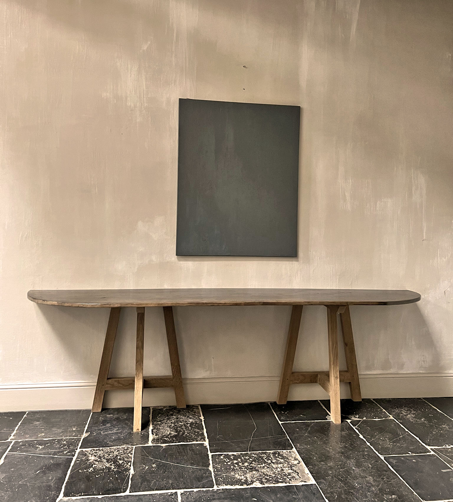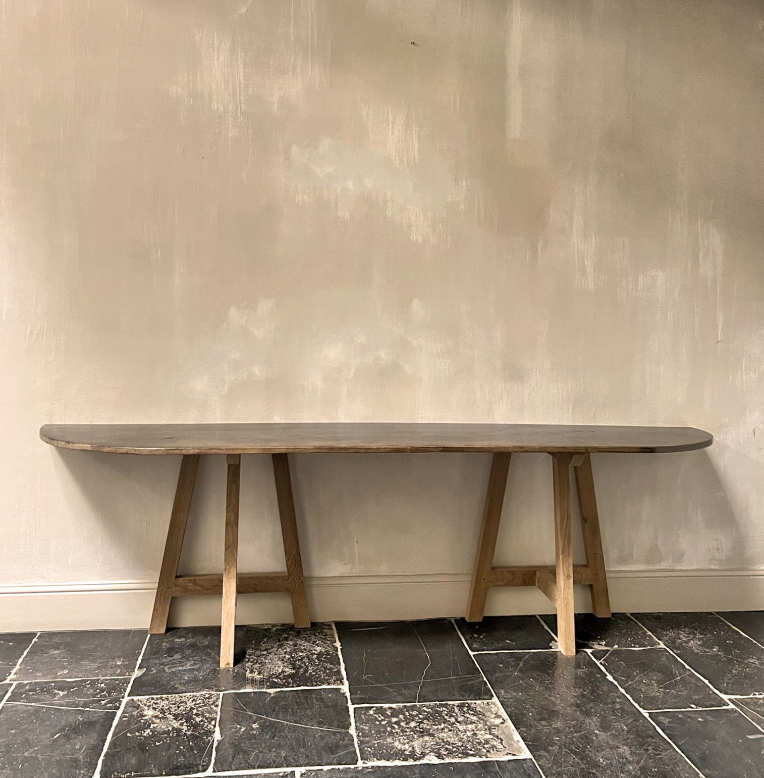 Onze rechthoekige basis met schragen van teruggewonnen eikenhout ondersteunt een 19e-eeuws blad van Italiaans notenhout uit één plaat. De buitenste uiteinden in demi lune vorm. 246 x 50 x 47 uur, ref. 4500