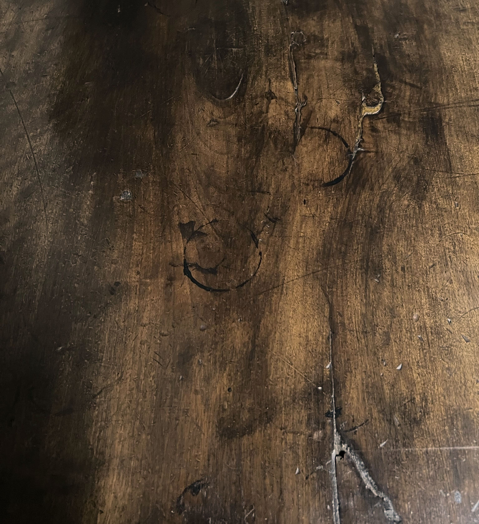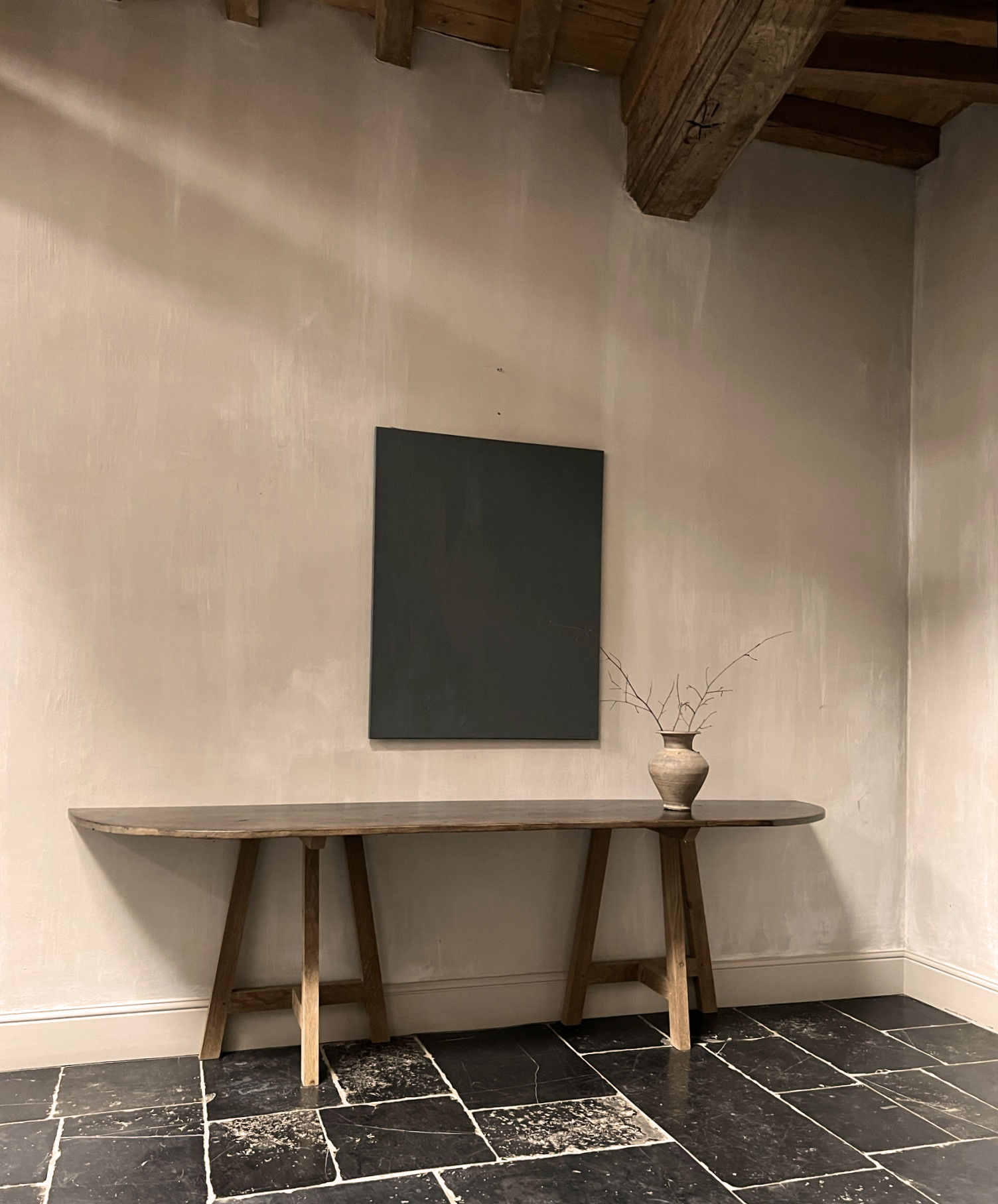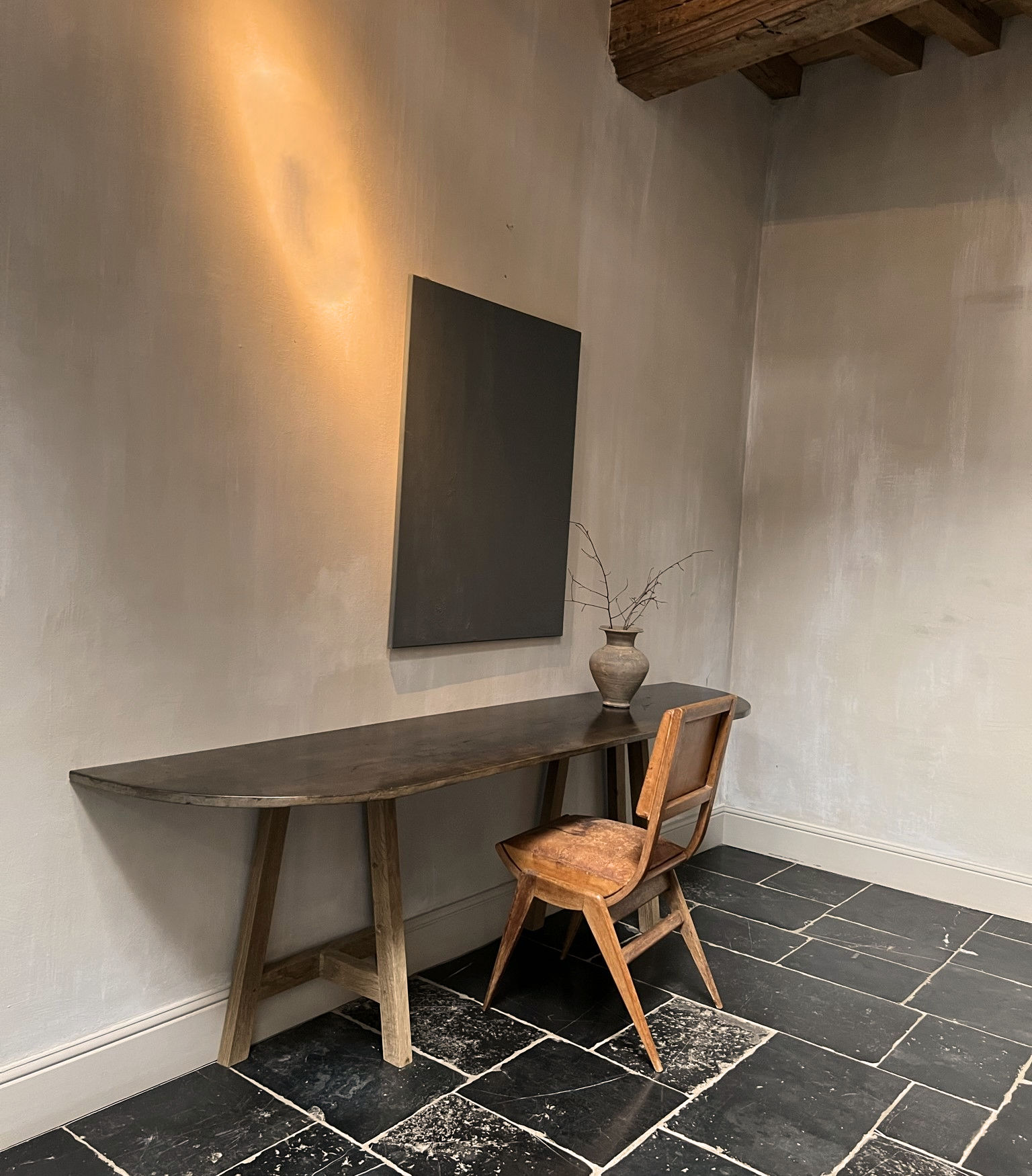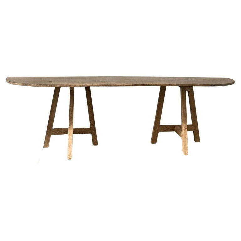 Onze rechthoekige basis met schragen van teruggewonnen eikenhout ondersteunt een 19e-eeuws blad van Italiaans notenhout uit één plaat. De buitenste uiteinden in demi lune vorm. 246 x 50 x 47 uur, ref. 4500