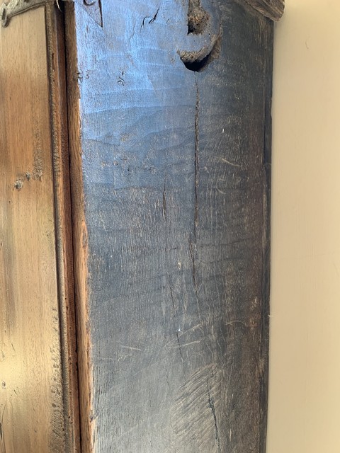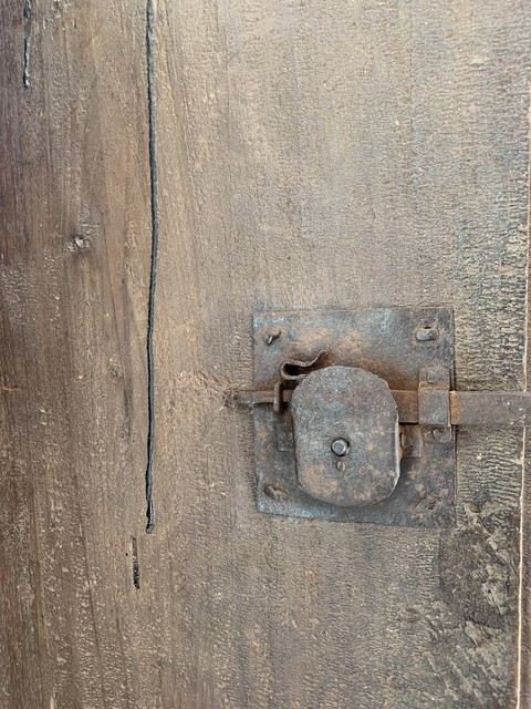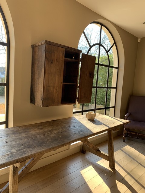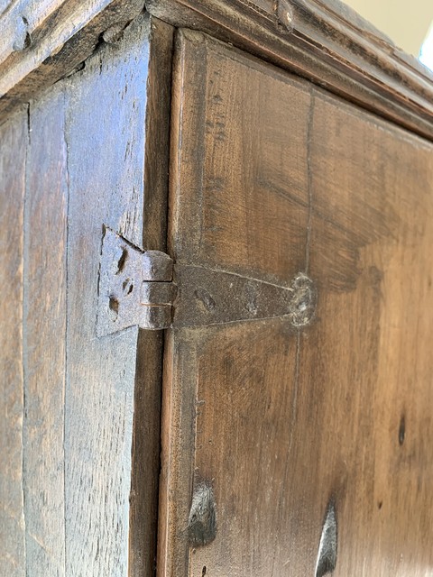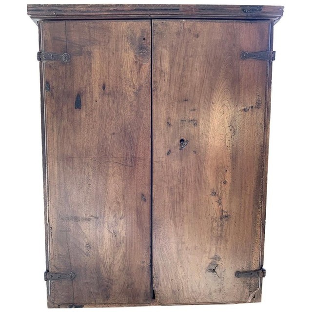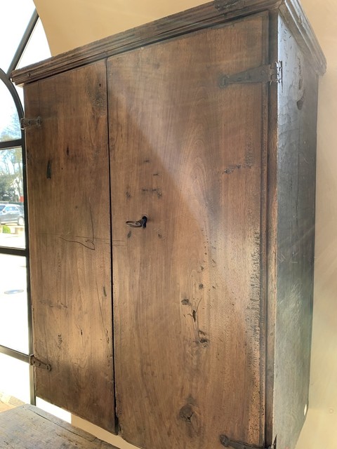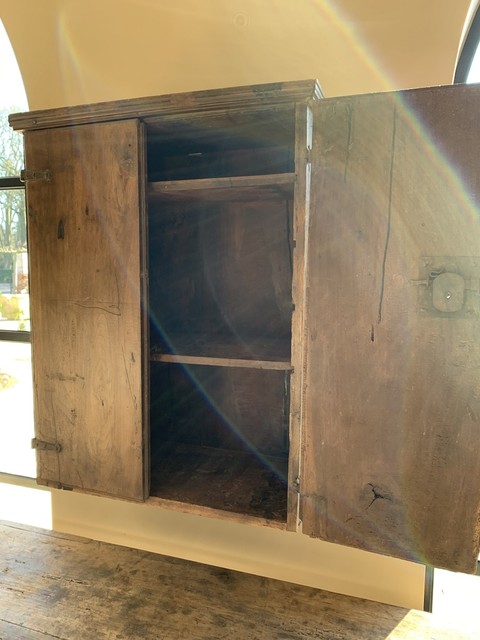 Een Italiaanse hangkast uit de 18e eeuw. De deuren en bestaan uit één stuk planken van notenhout. Met originele scharnieren en smedwerk.